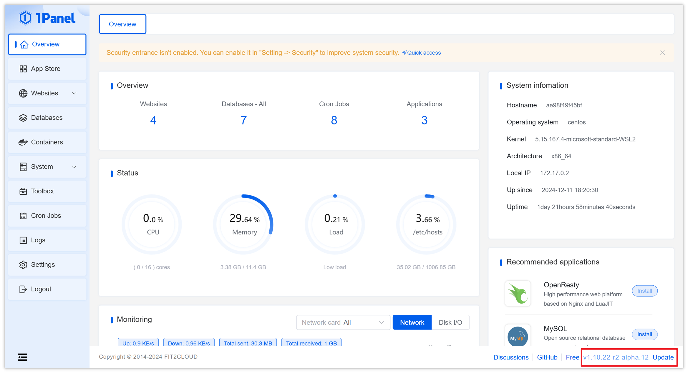 To perform an online upgrade, you can find the current version of 1Panel in the bottom right corner of the 1Panel Web console and click the Update button.