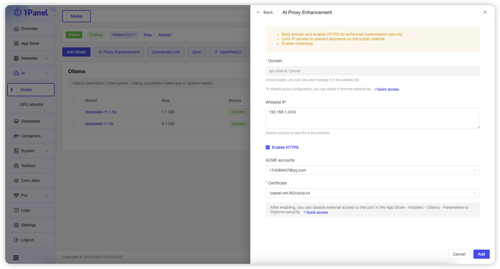 This feature allows you to configure a reverse proxy for the Ollama application, supporting domain names, HTTPS, IP whitelists, and other configurations to enhance security when using large models.