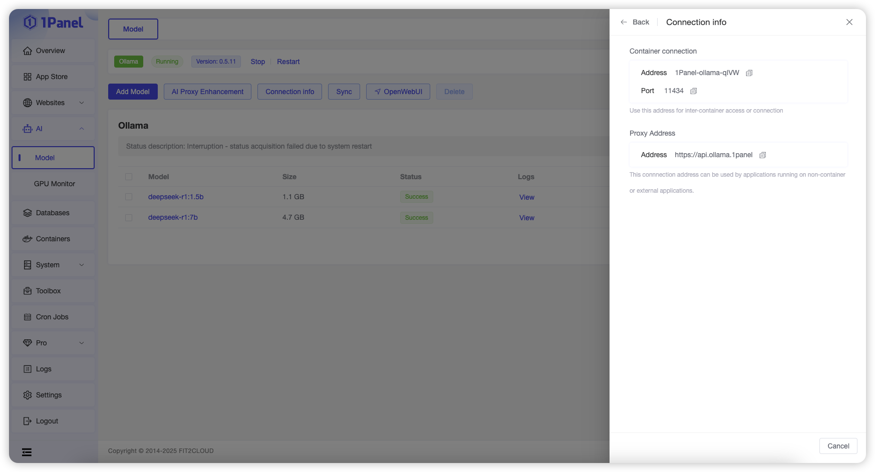 The Ollama application deployed from the App Store runs in a containerized manner. Different scenarios require selecting the corresponding connection information based on the prompts on the page.