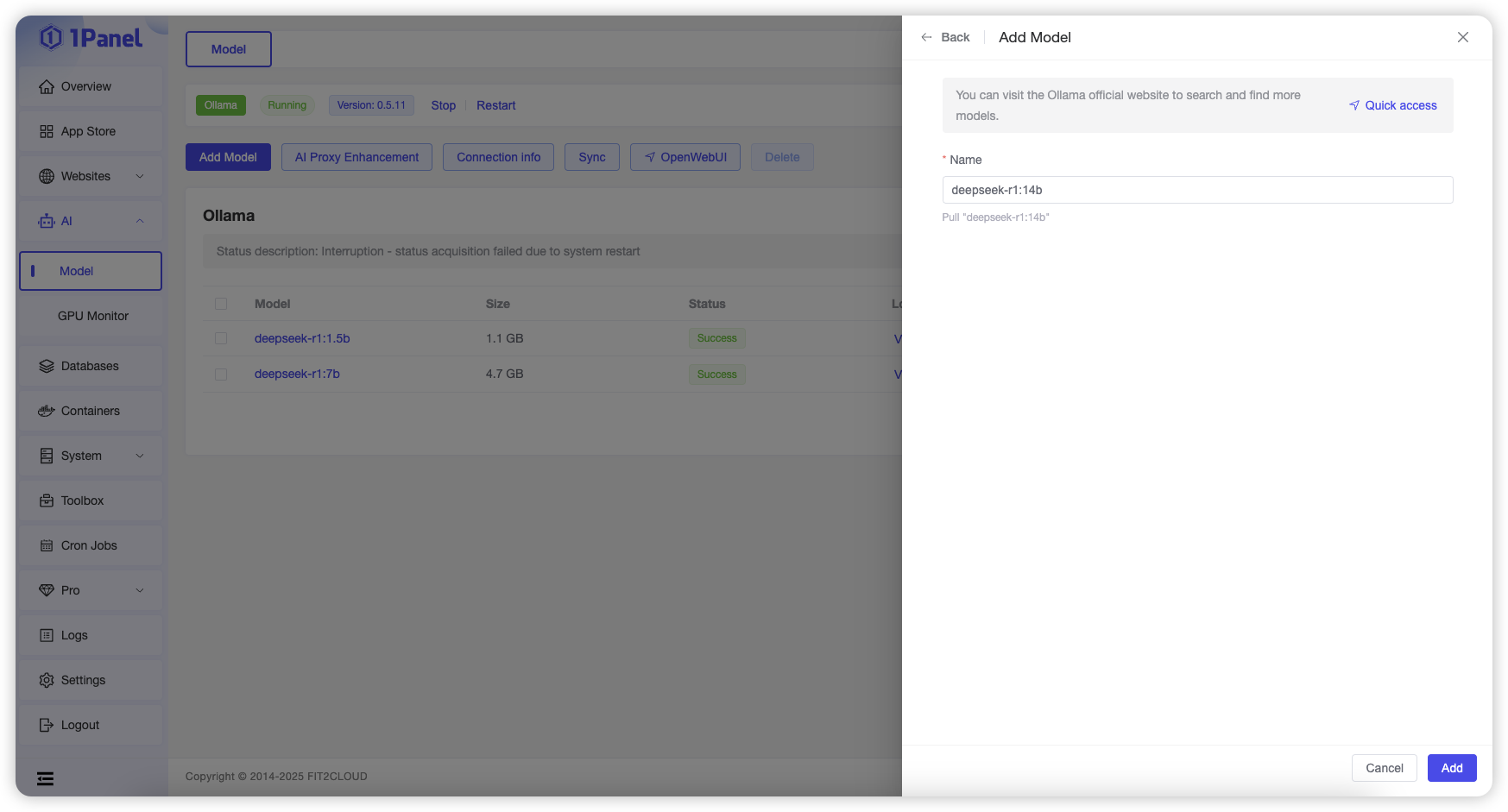 Click "Add Model," enter the model name, and click the "Add" button to pull the corresponding model from the Ollama Official Repository.