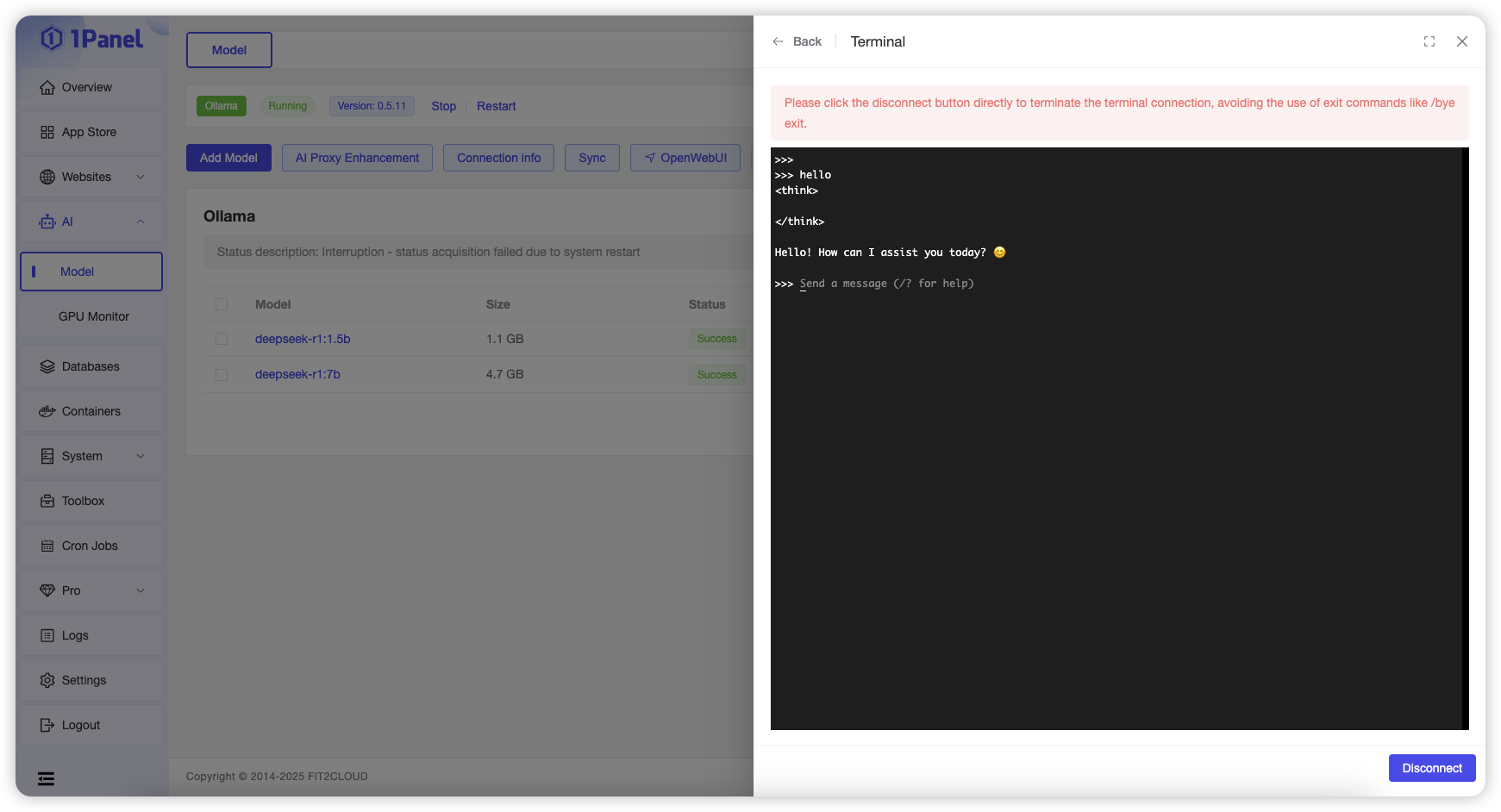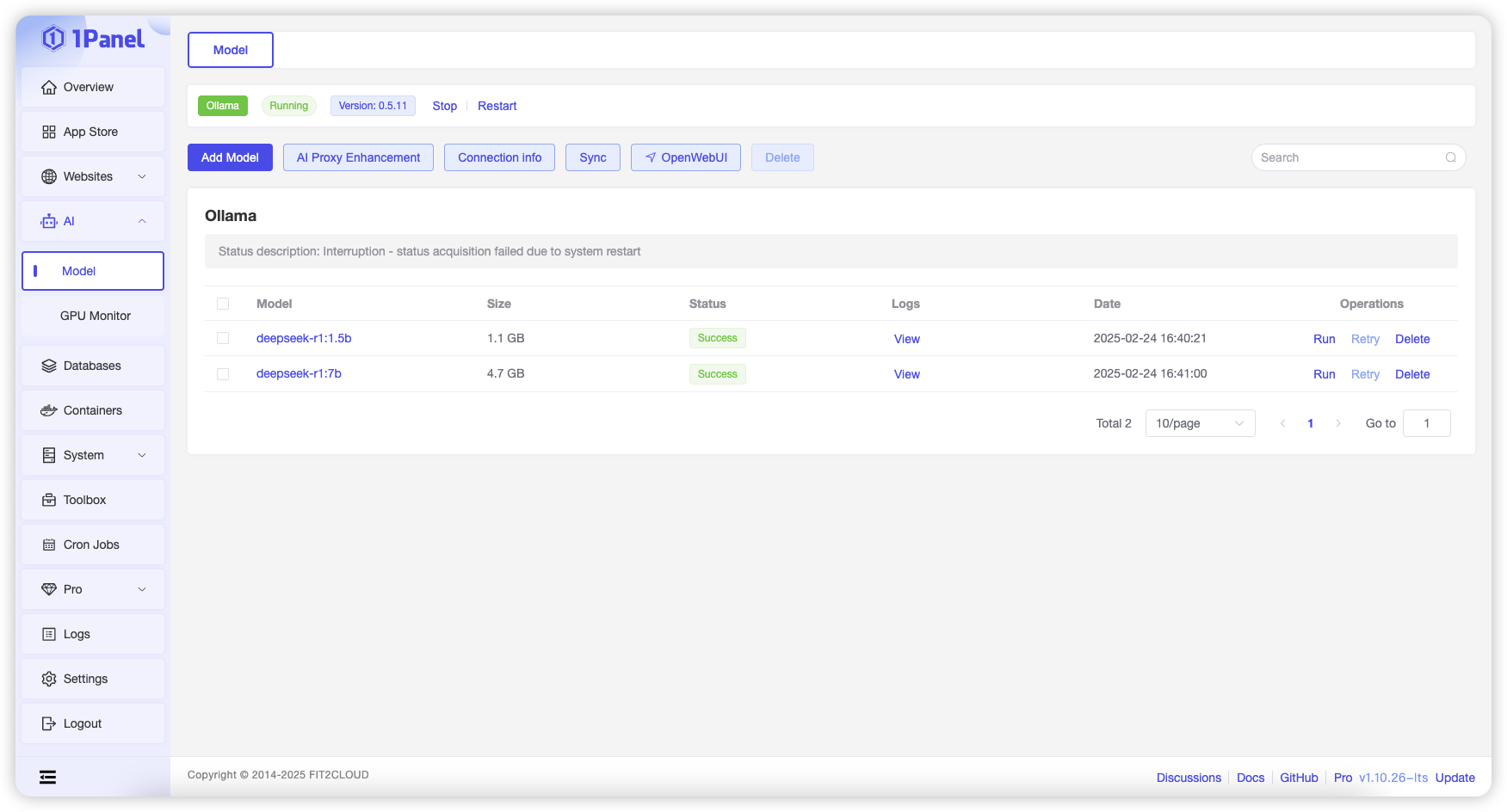 To use the model management feature, you need to first install the Ollama application from the App Store. After installation, you can view the status of the Ollama application on this page and perform operations such as starting, stopping, and restarting.