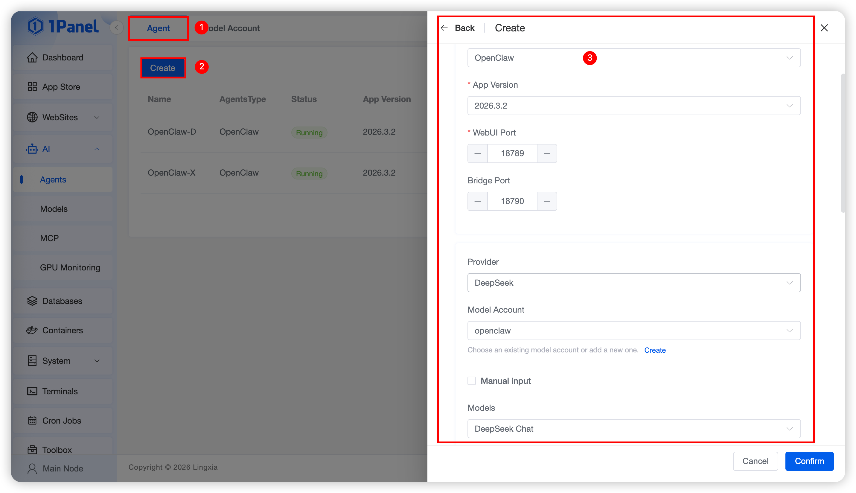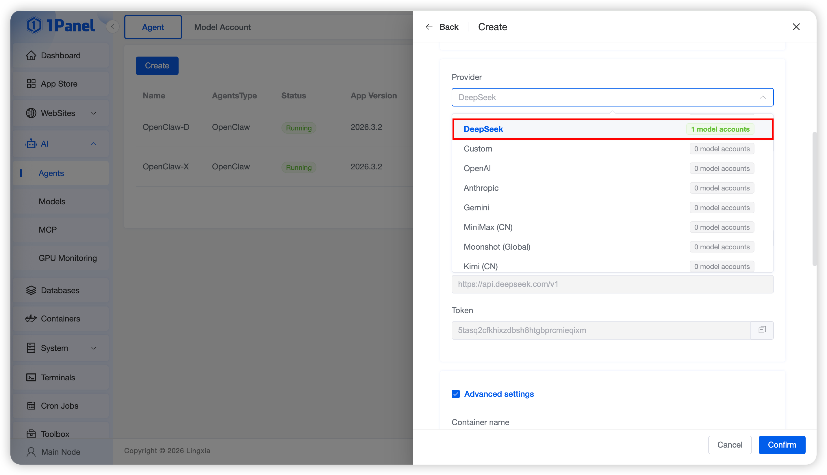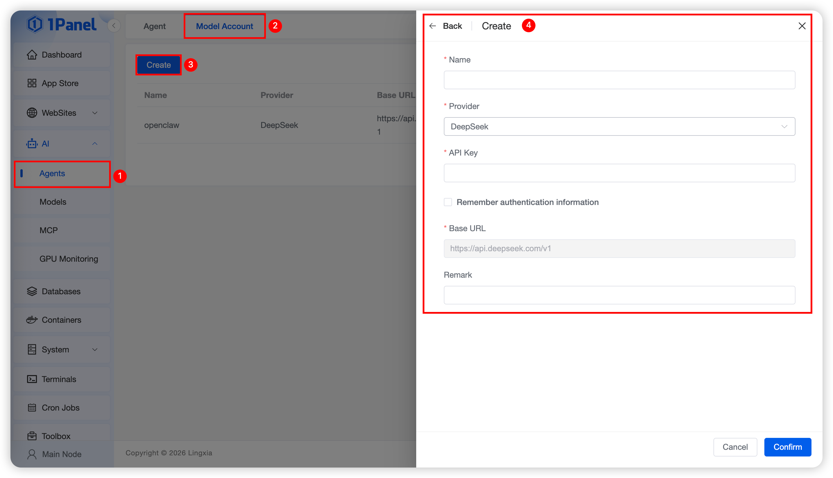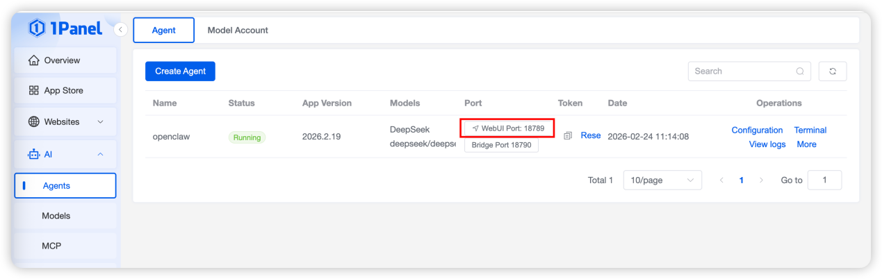 The installation of OpenClaw is deployed based on the agent management of 1Panel, and the DeepSeek large model API key obtained in the previous step needs to be used during the deployment process. In 1Panel, the deployment of OpenClaw and the management of large model API key accounts are divided into two separate parts and decoupled from each other, mainly to facilitate the adjustment of model configurations for your OpenClaw personal assistant.