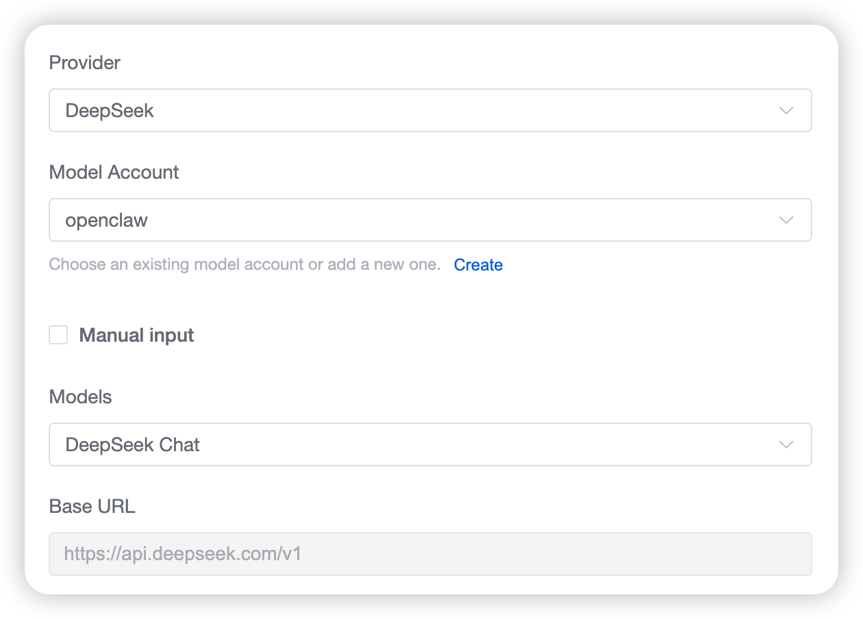 - Other Model Parameters: After selecting the model provider, the system will automatically retrieve the maintained model accounts, as shown in the figure below. You can also check "Manual input" to enter the model information manually. If no model account has been created, click "Create model account" to complete the creation.