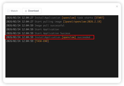 After configuring all the above parameters, click "Confirm" directly to start the installation of OpenClaw. The installation is completed when the prompt as shown in the figure below appears.