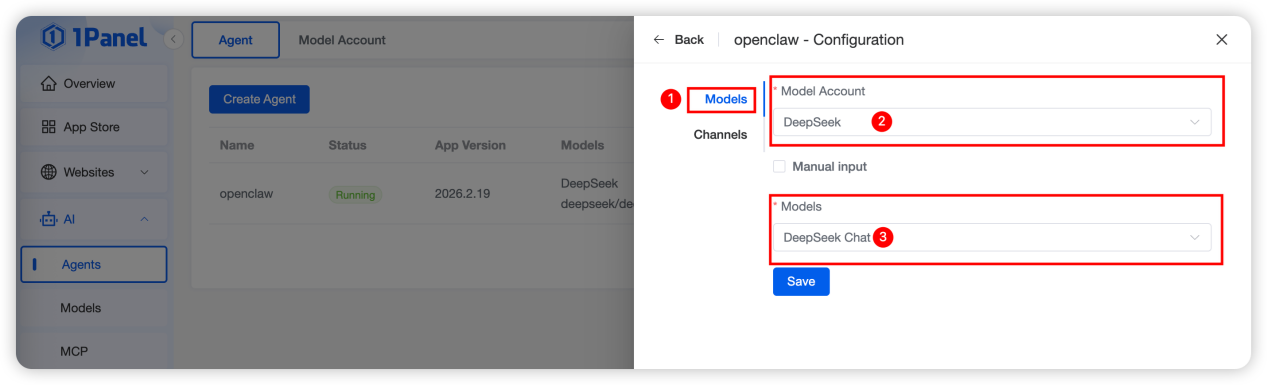 After completing the configuration, enter the "Configuration" page of "Agent" in 1Panel, complete the Discord chat channel configuration, and click "Save", as shown in the figure below: