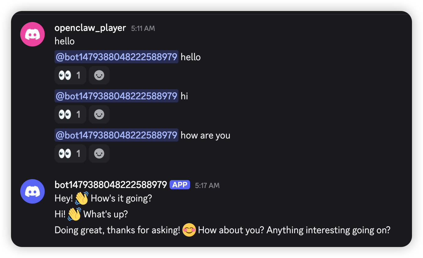 - In the target channel (e.g., #general), send a message mentioning the bot (e.g., @OpenClaw Bot hello).