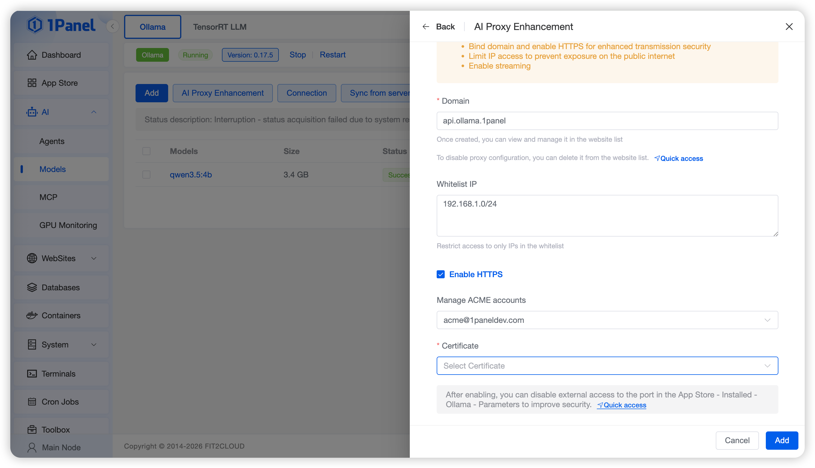 This feature allows you to configure a reverse proxy for the Ollama application, supporting domain names, HTTPS, IP whitelists, and other configurations to enhance security when using large models.