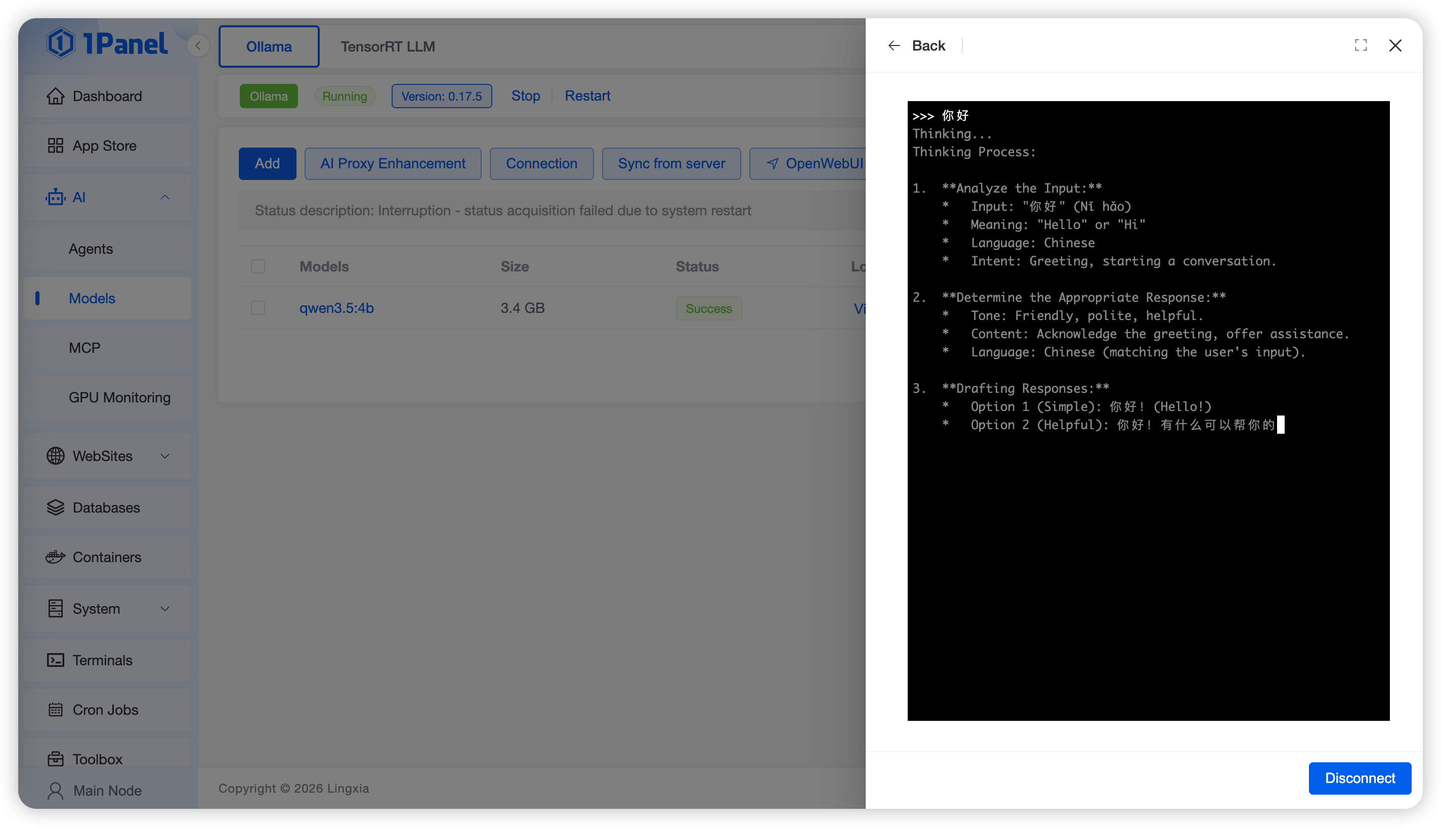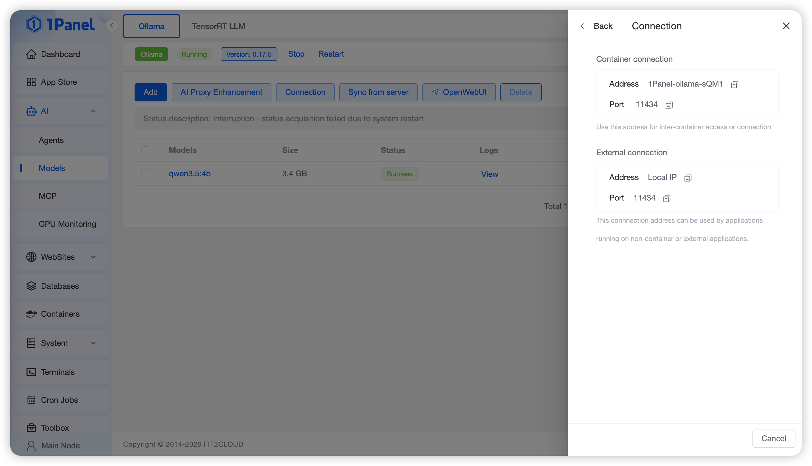 The Ollama application deployed from the App Store runs in a containerized manner. Different scenarios require selecting the corresponding connection information based on the prompts on the page.