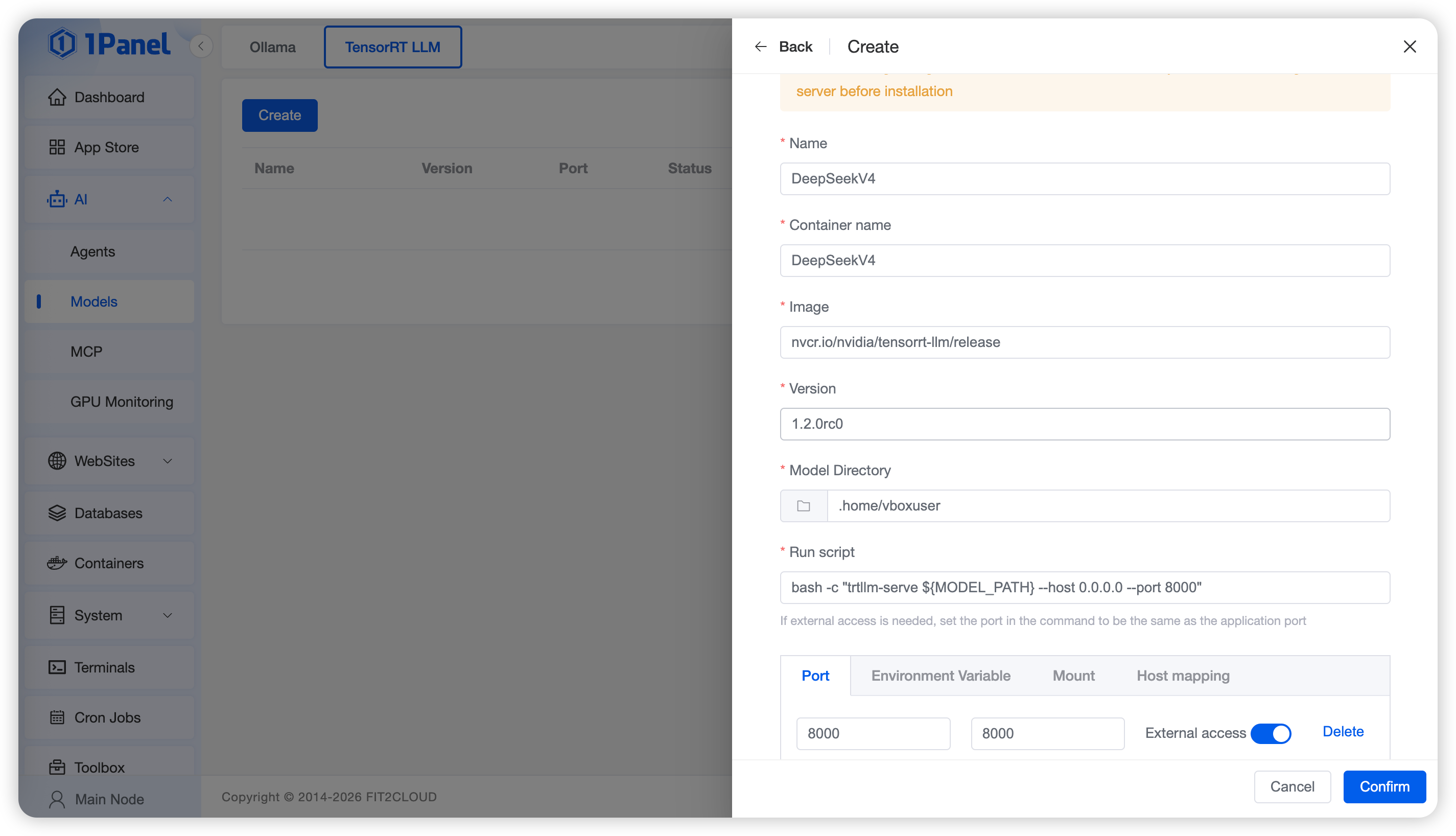 - Model Directory: Select a local model directory on the server to mount into the container. The model folder must be placed in this directory in advance.