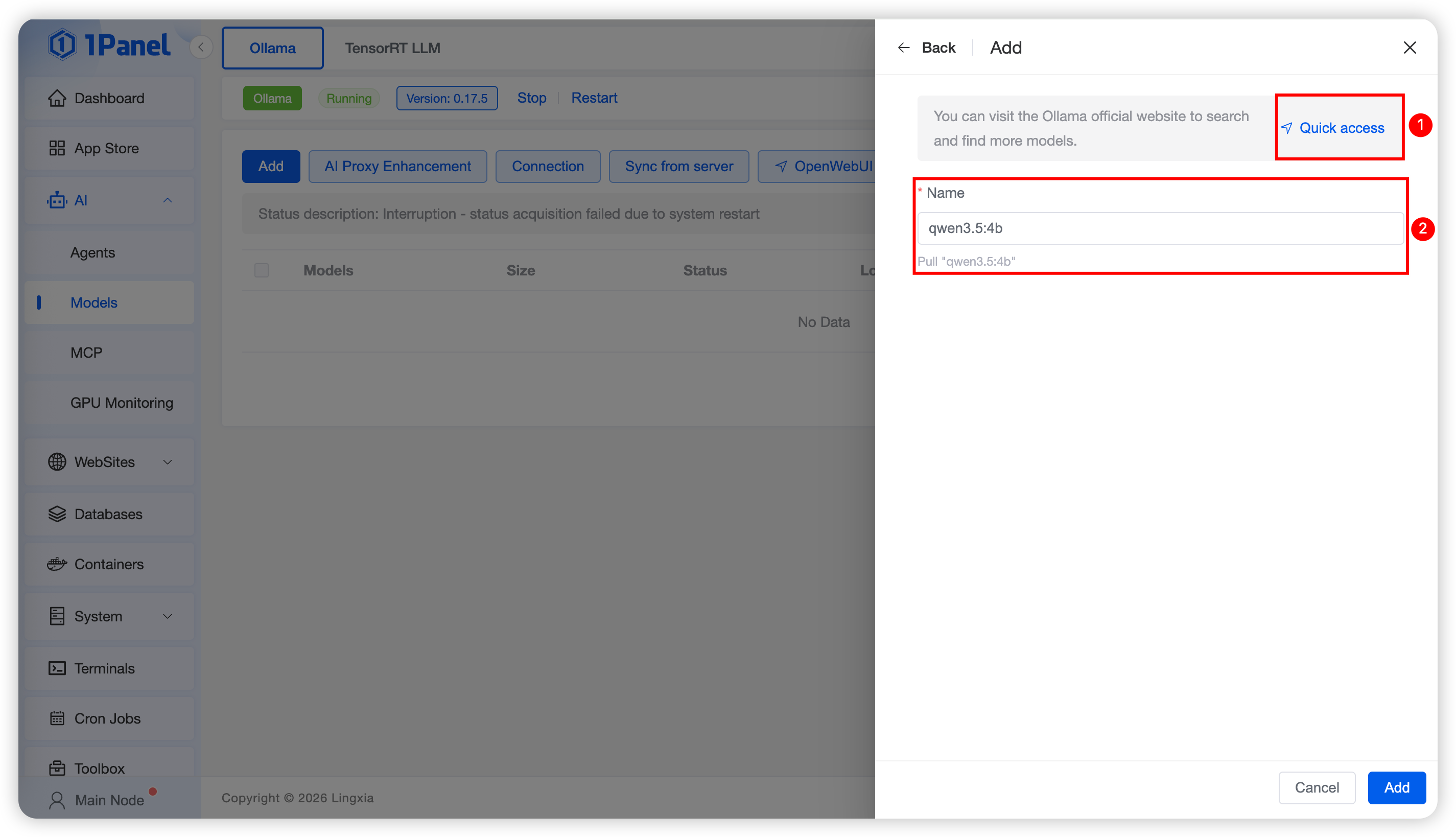 Click "Add Model," enter the model name, and click the "Add" button to pull the corresponding model from the Ollama Official Repository.