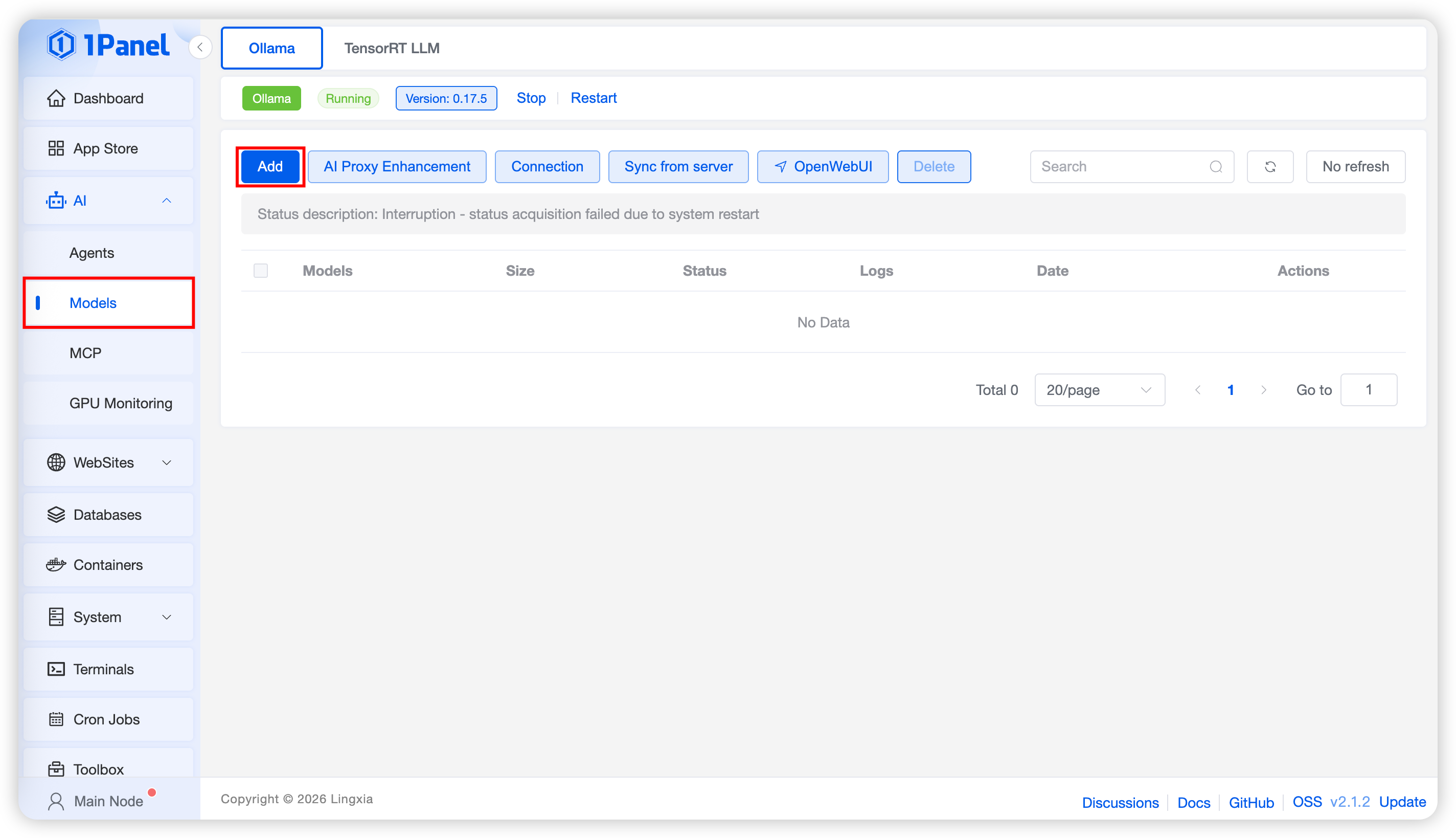 To use the model management feature, you need to first install the Ollama application from the App Store. After installation, you can view the status of the Ollama application on this page and perform operations such as starting, stopping, and restarting.