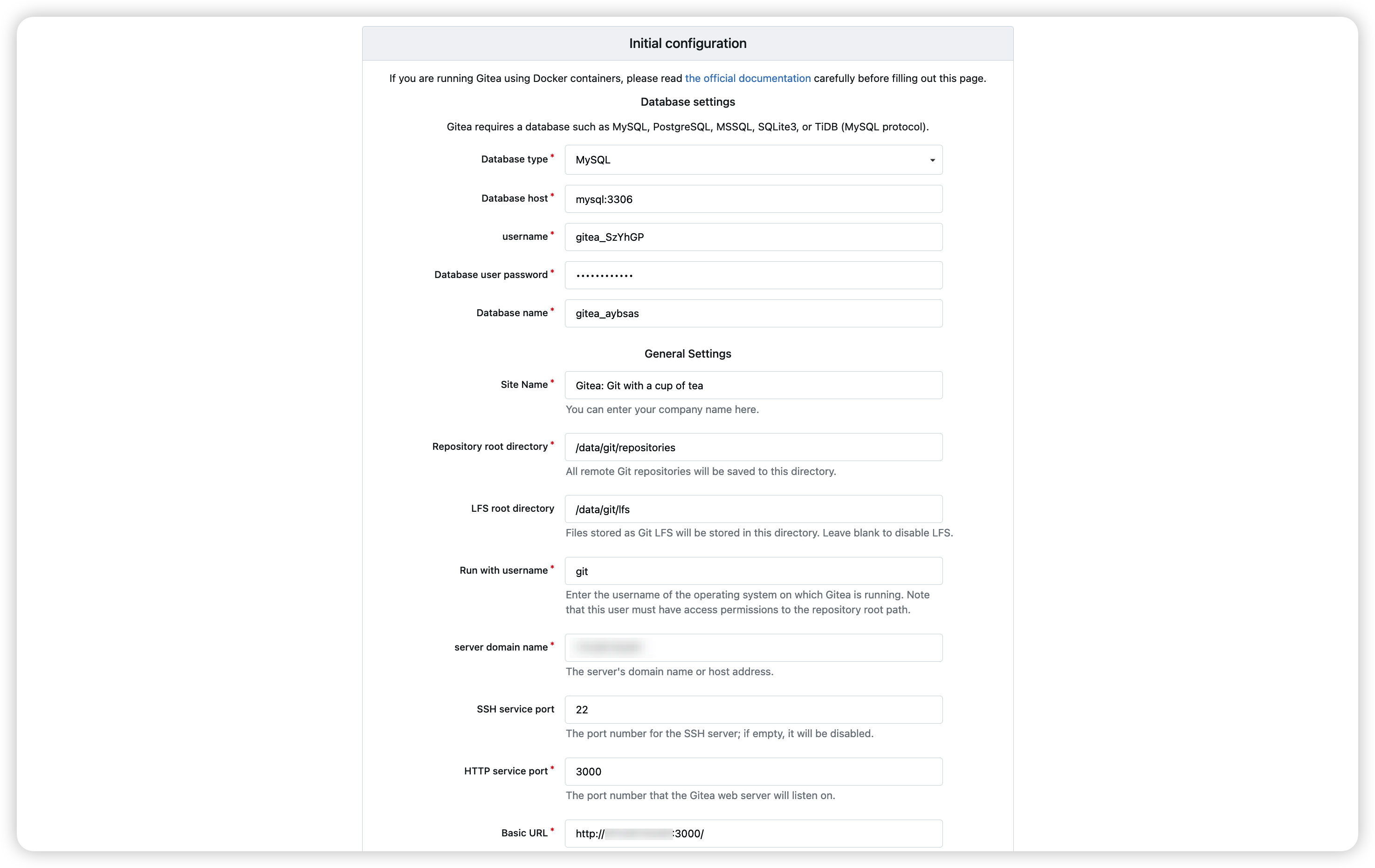 - SSH Port: Access port for Git over SSH (default: 222)