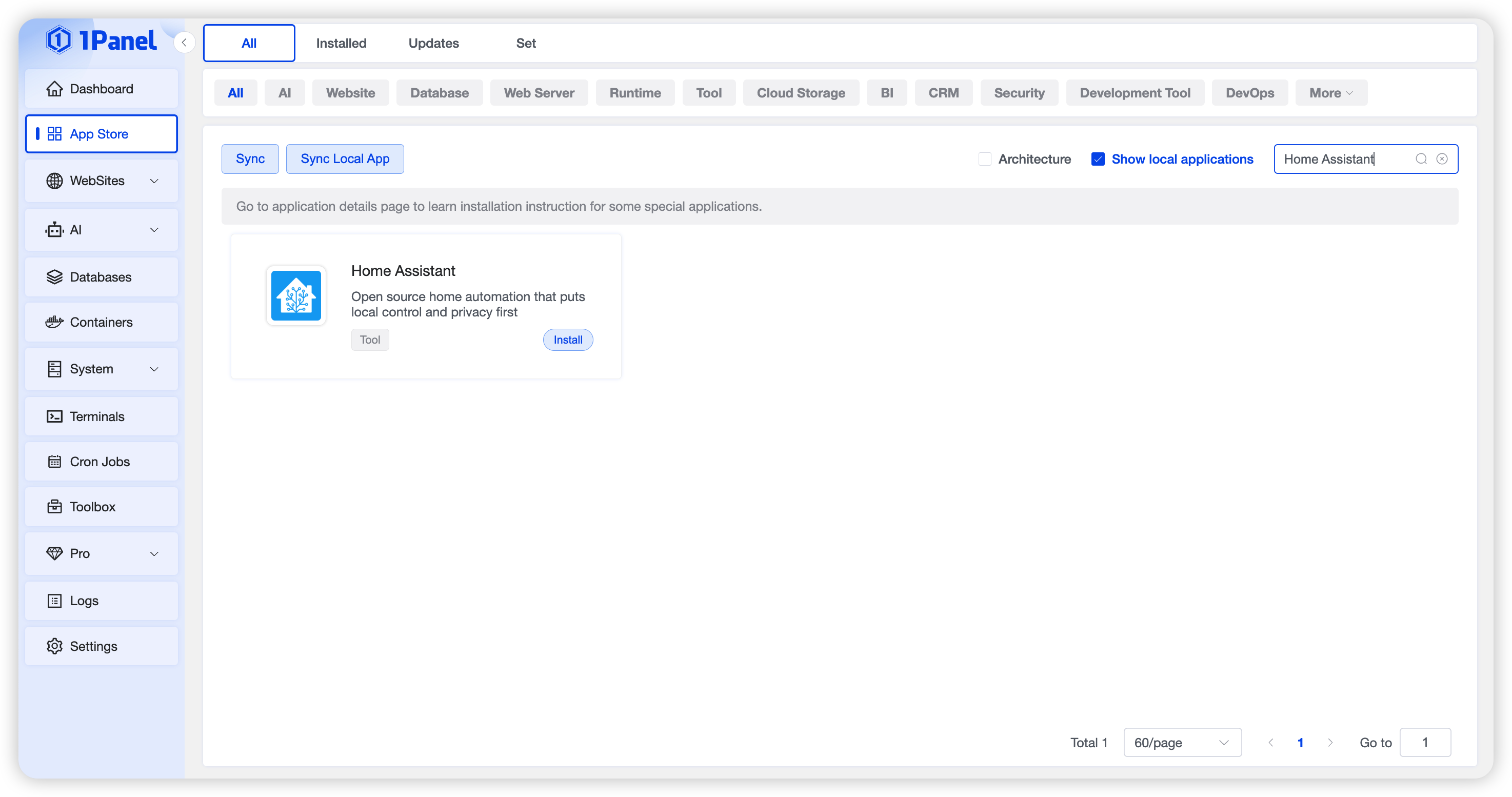Enter Home Assistant in the search box in the upper right corner, click the application card to go to the details page, then select Install.