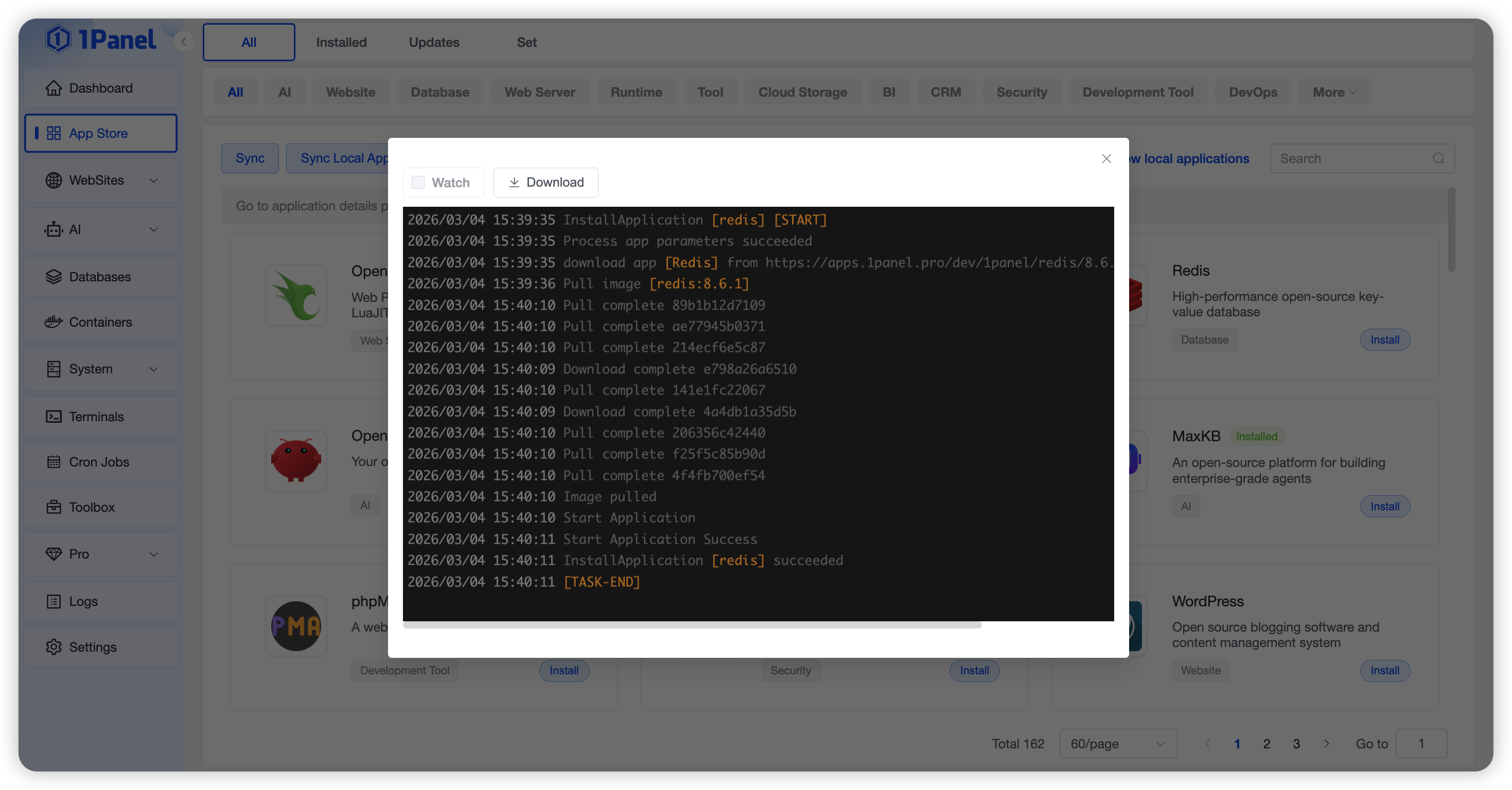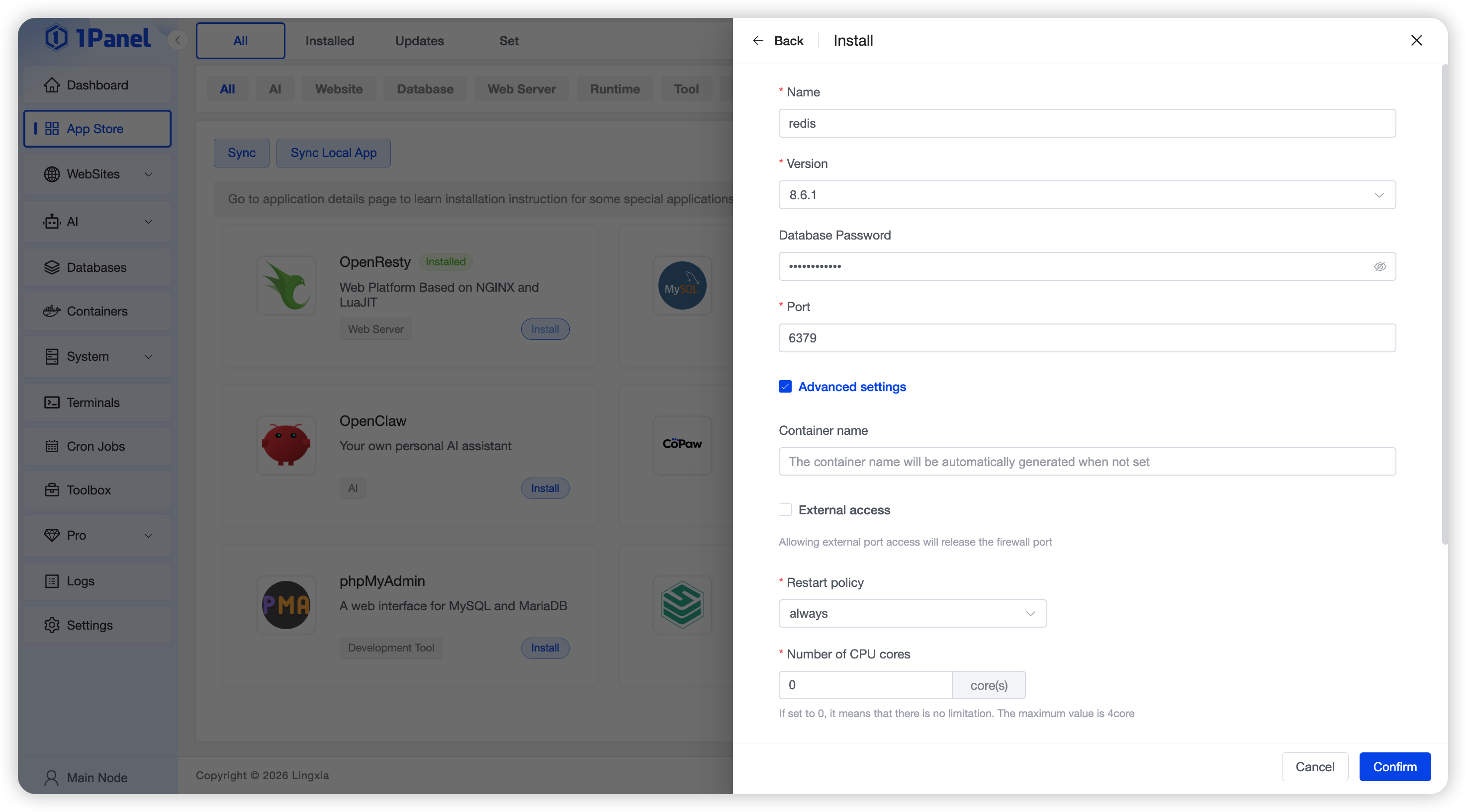 (3) Configure advanced settings, such as whether to expose external ports, set resource limits, and edit the Compose file. Finally, click the Confirm button. The application installation log interface will appear; wait for the installation to complete.
