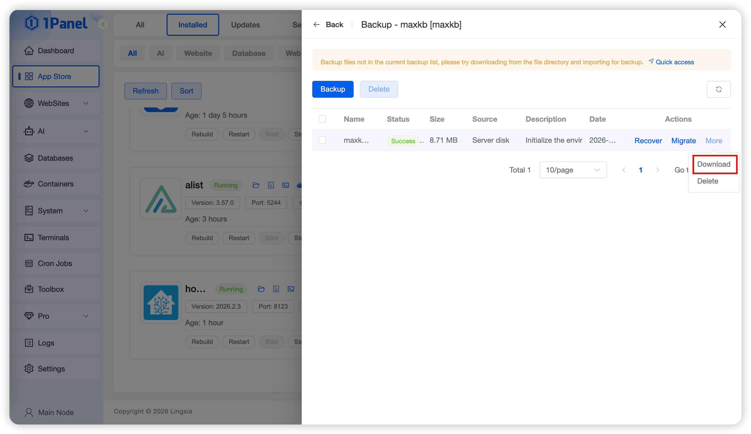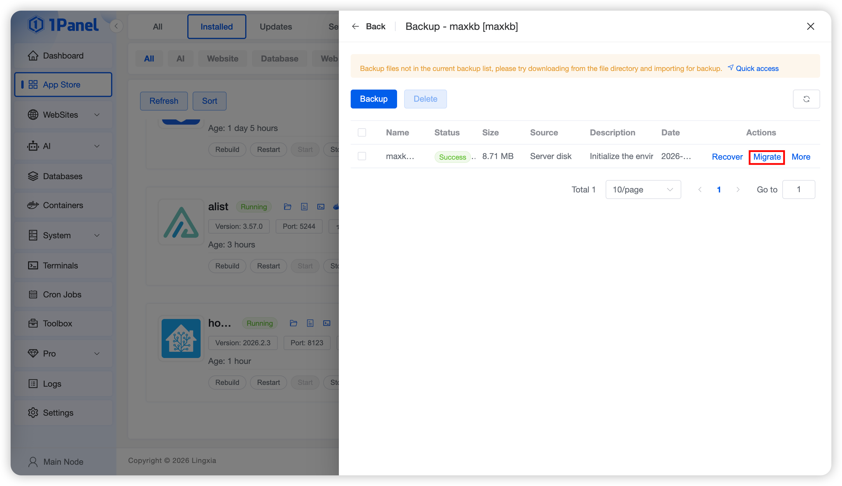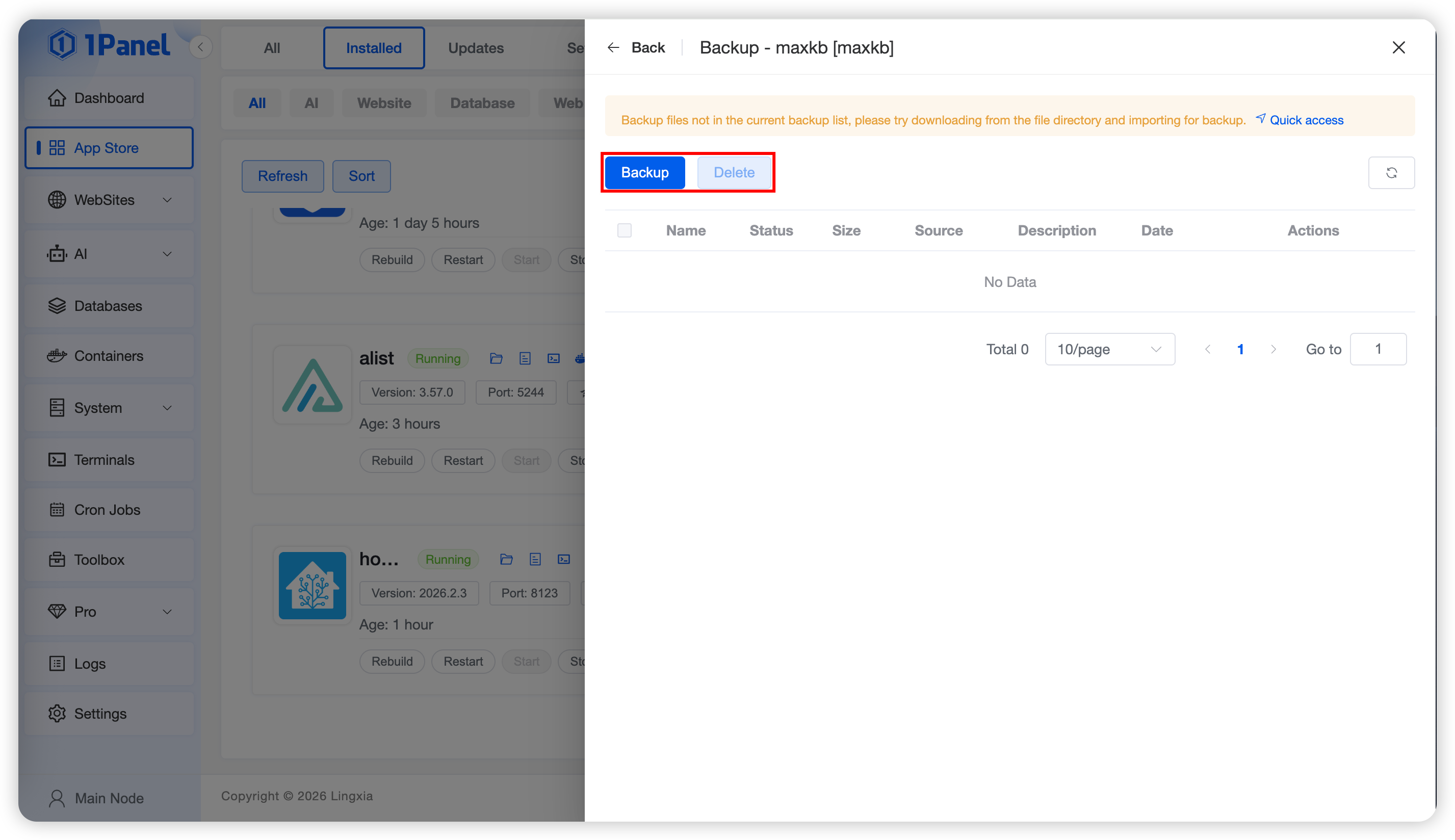 Click the Backup button to back up the current application immediately. To restore the application, click the Restore button in the backup list to revert the application to the corresponding state using the selected backup.