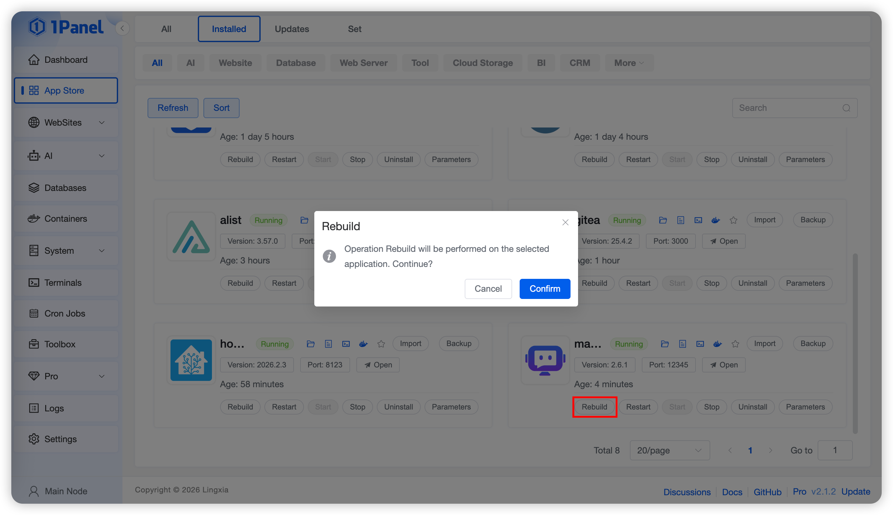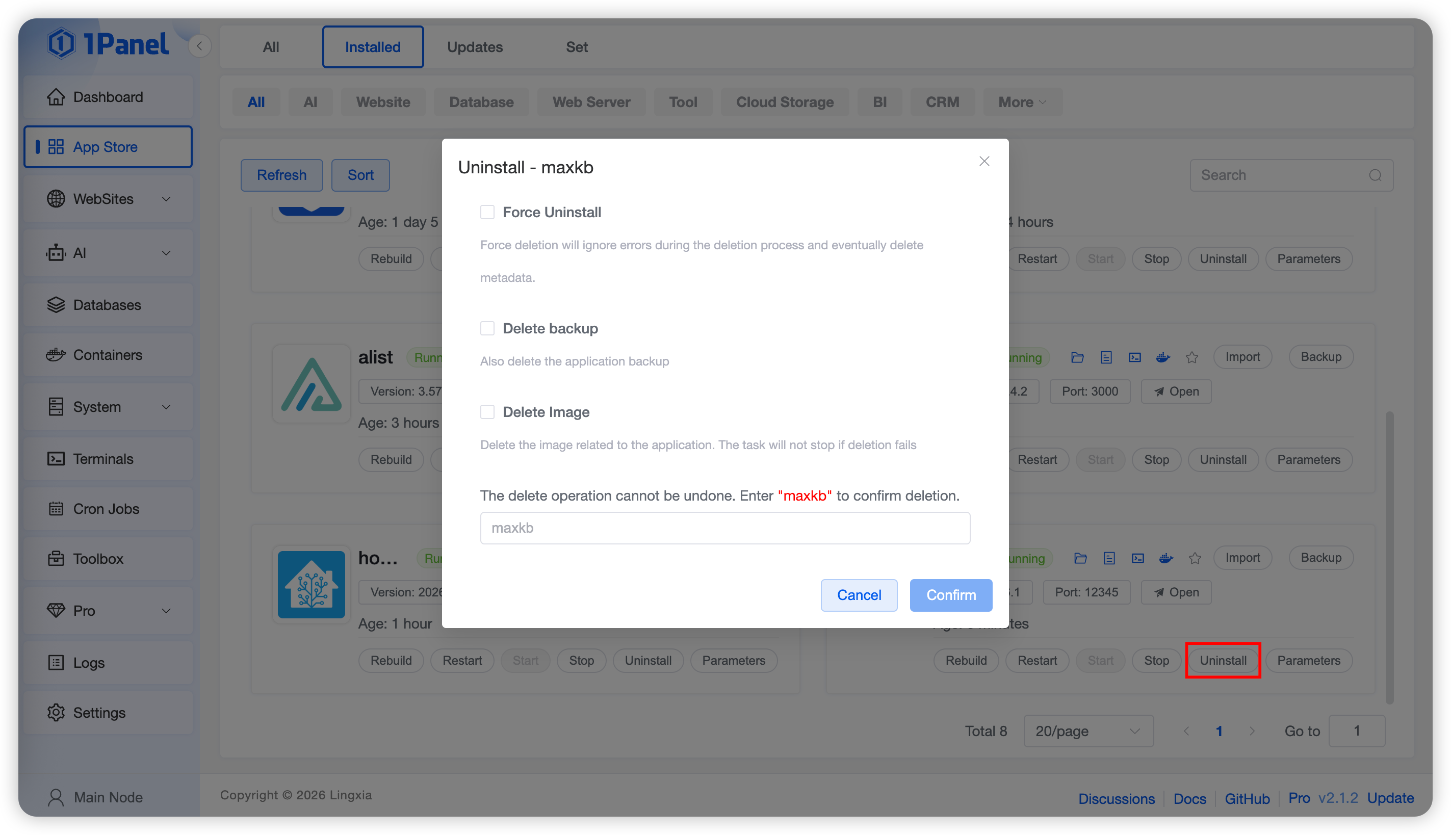 Click the Uninstall button. The system will automatically perform the uninstallation process and delete all resources related to the application, including containers, configuration files, etc.