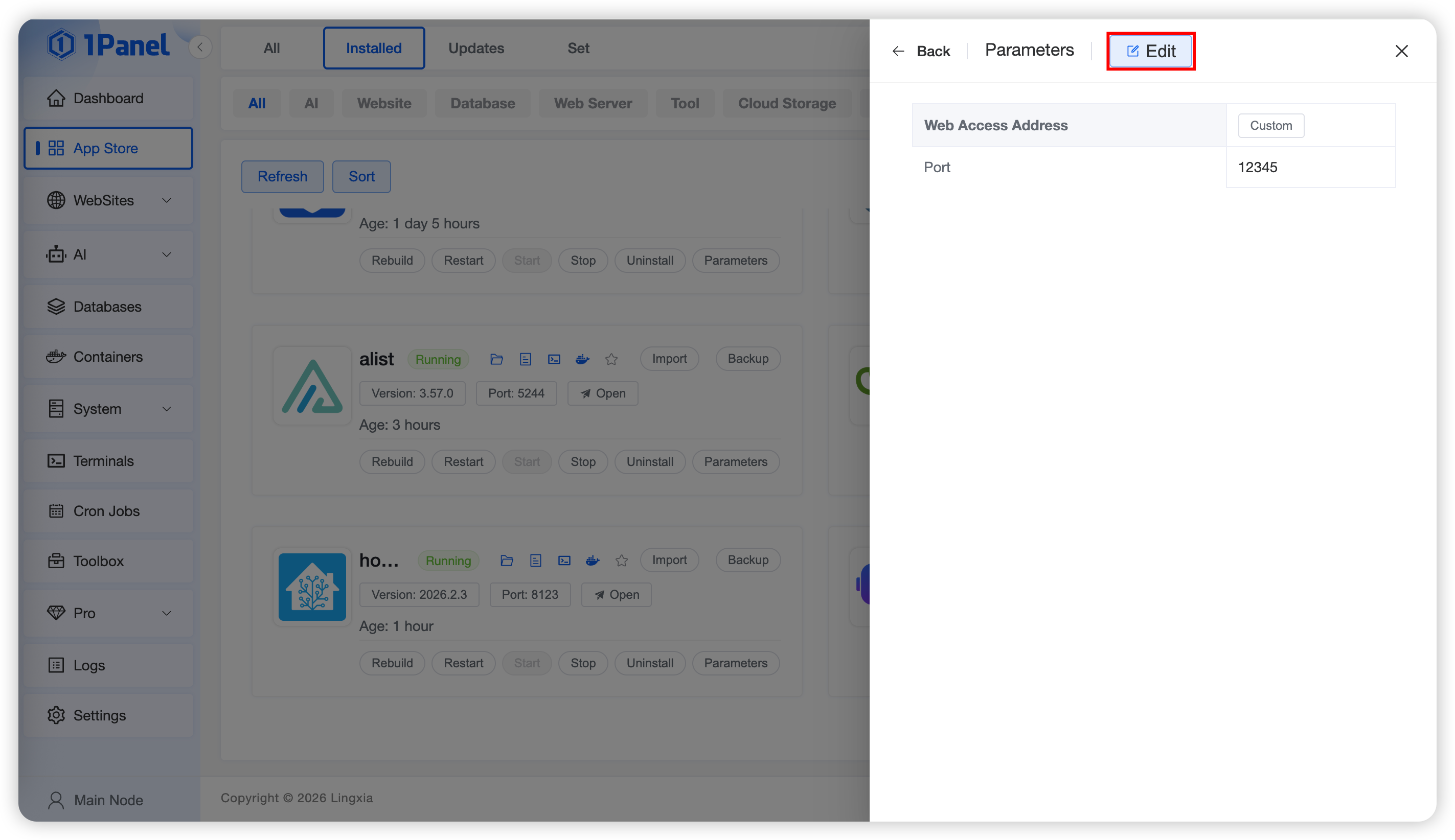 Click the Edit button in the upper right corner of the parameters page to modify partial application parameters and advanced settings. The modifiable parameters depend on the application definition.