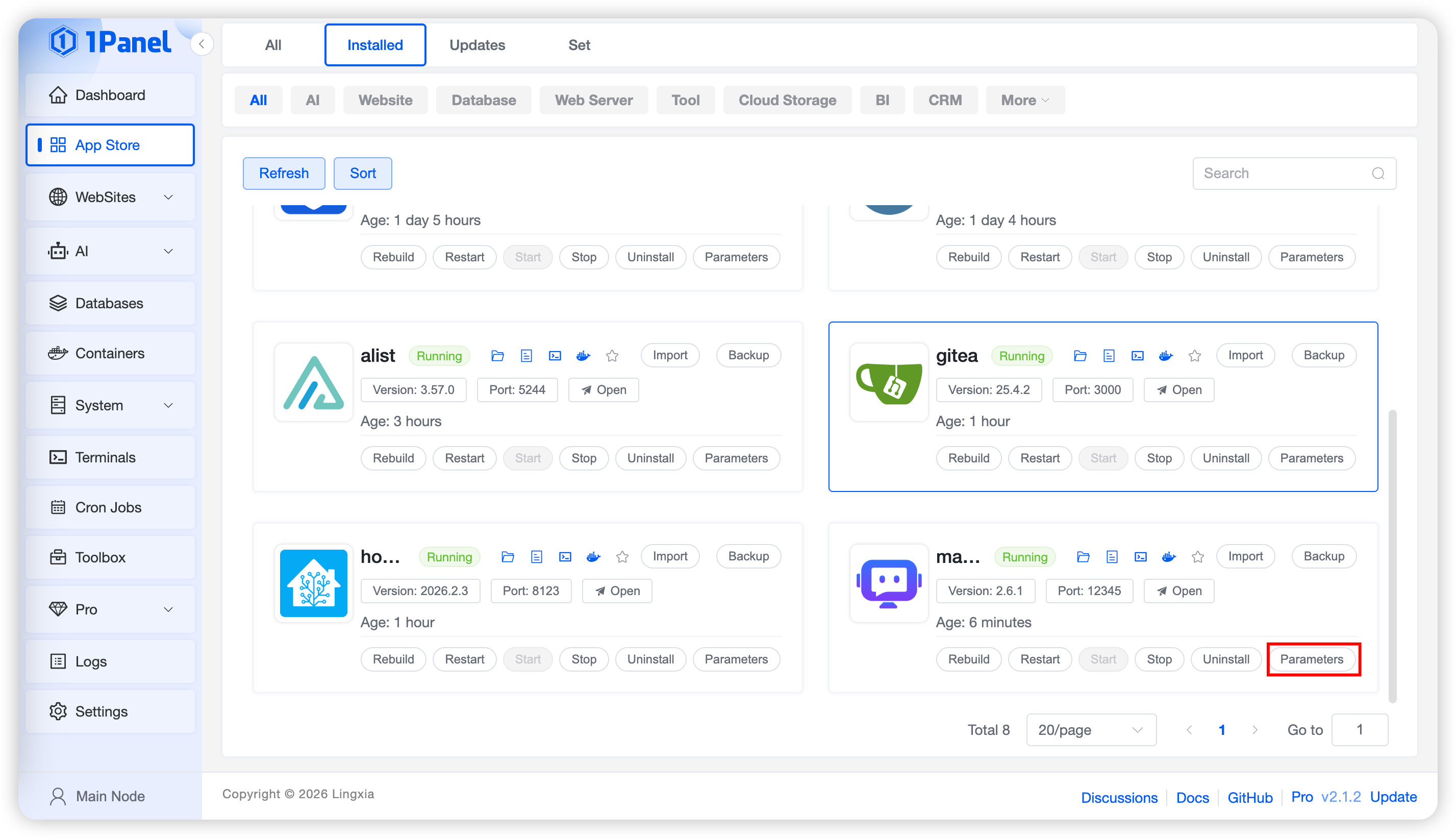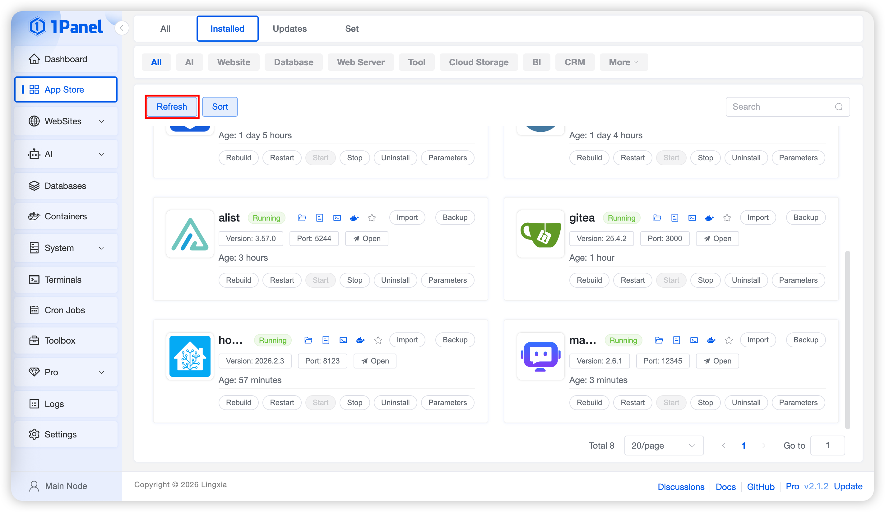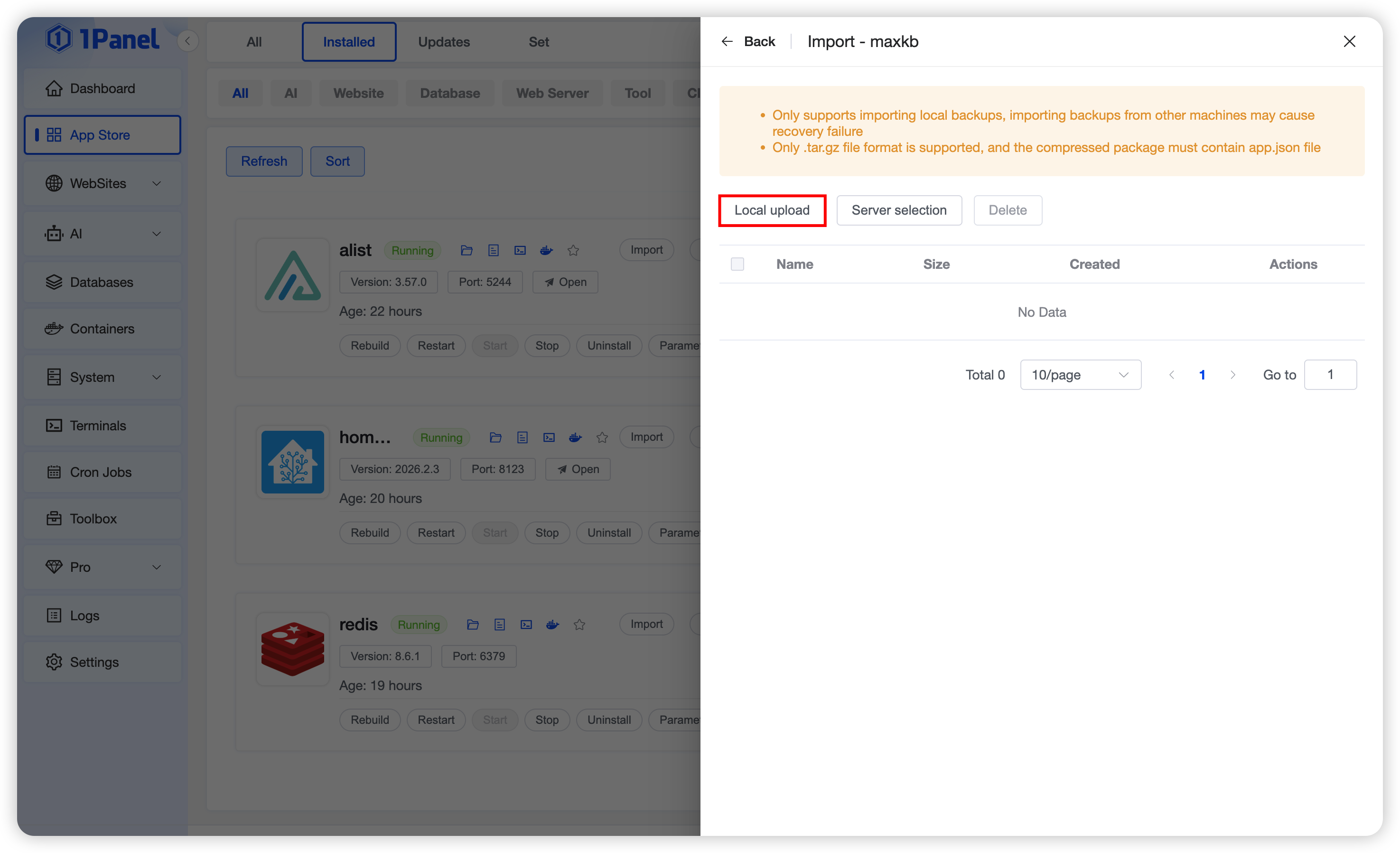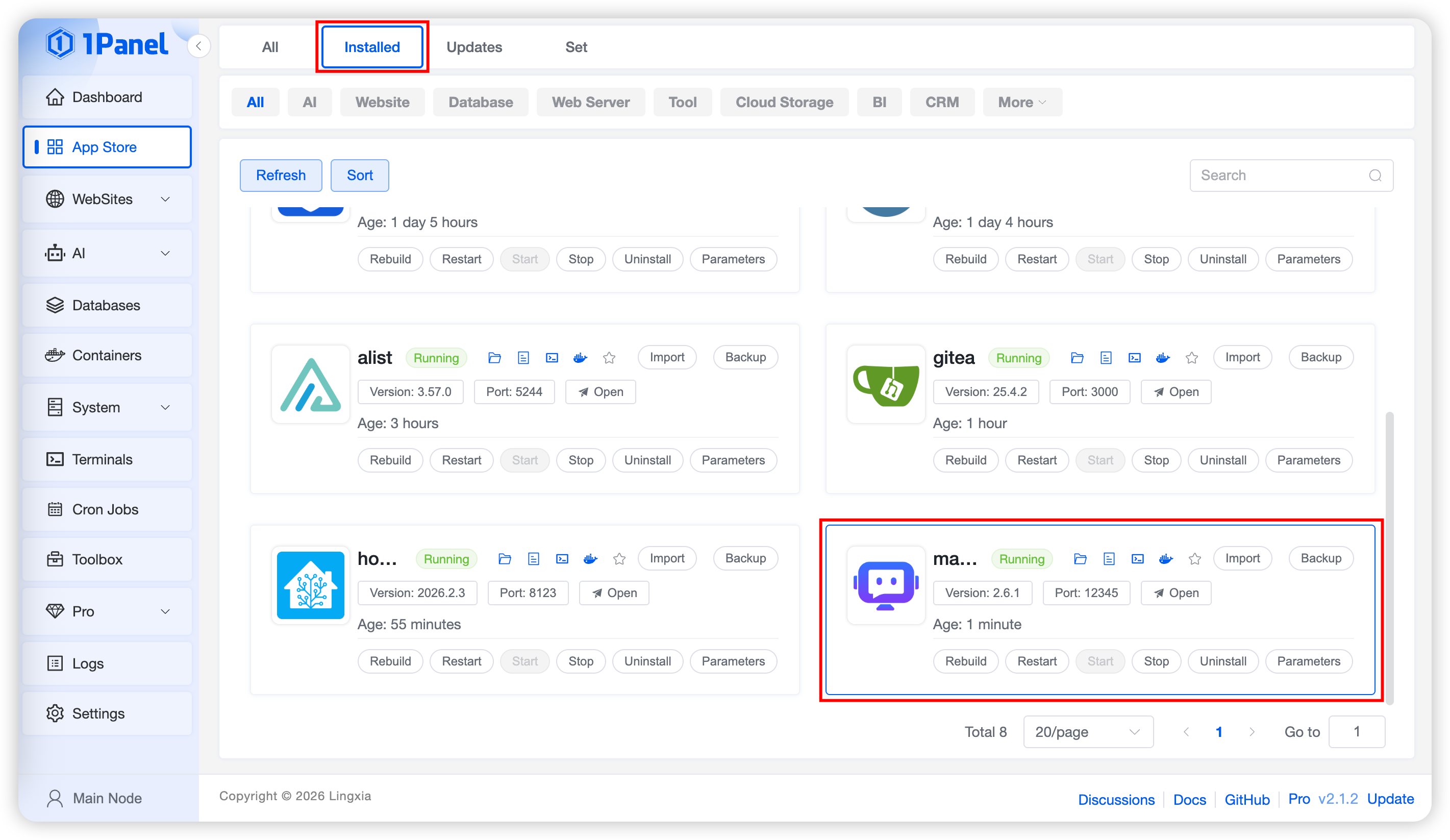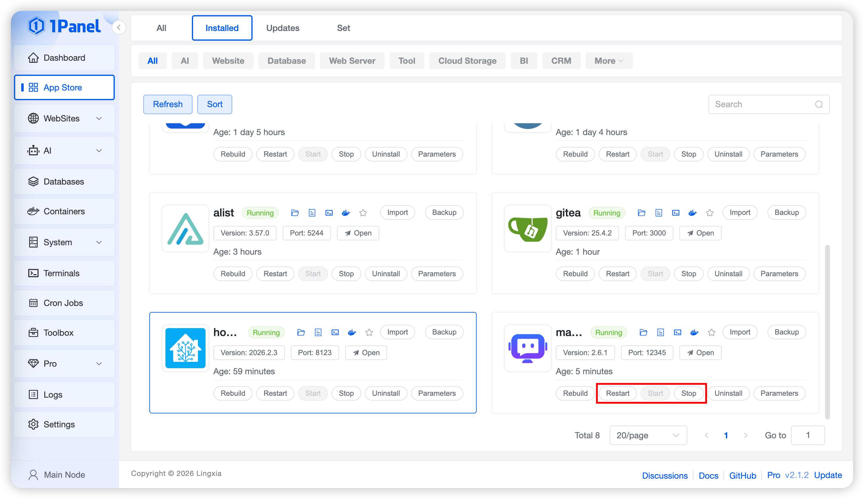 On the Installed list page, you can perform operations on applications including sync, upgrade, restart, start, stop, delete, backup, and restore.