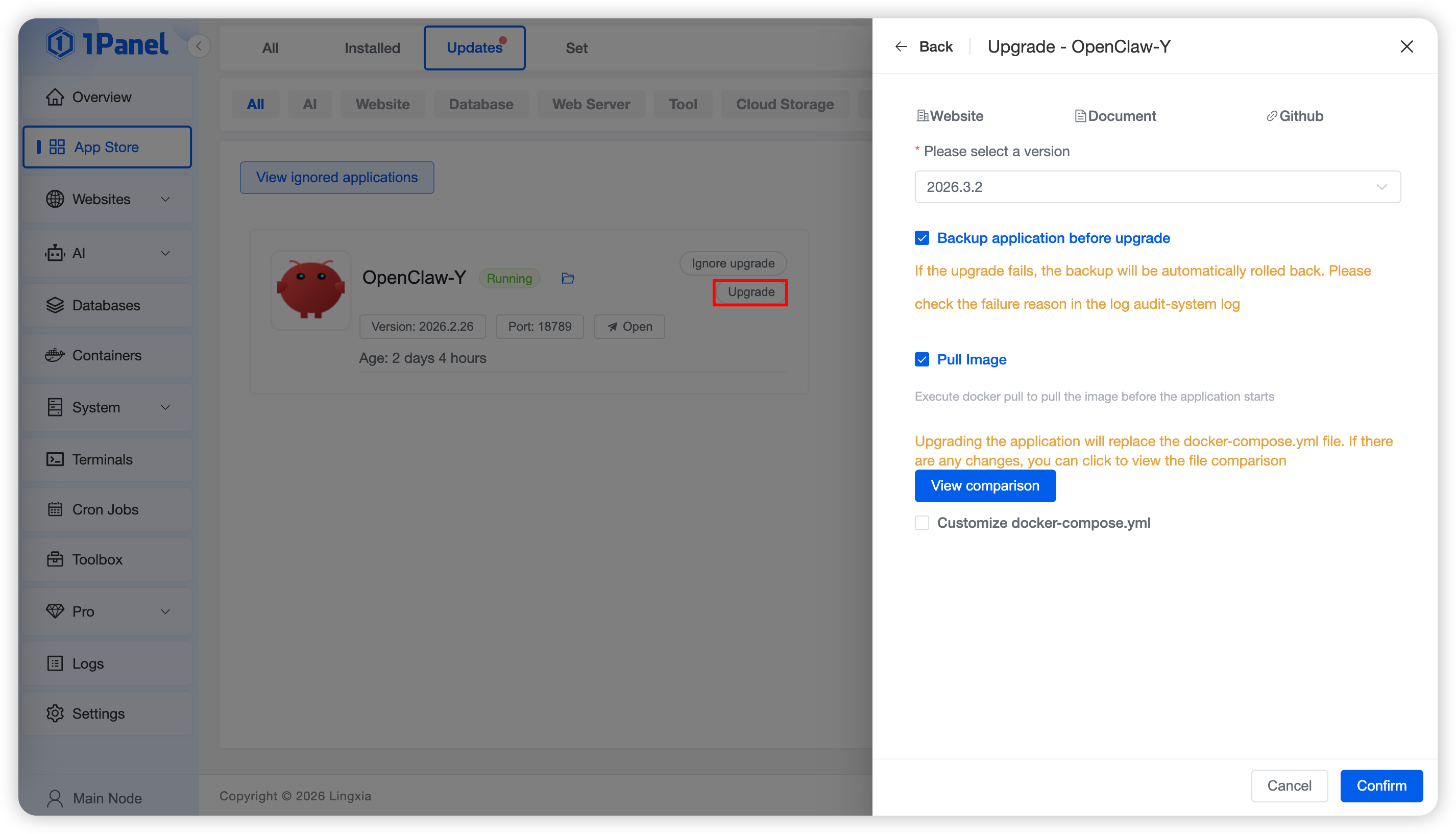 After clicking the Upgrade button, select the target version. You can choose to back up the application before upgrading, automatically pull the latest image, and customize the compose.yml file. Finally, click Confirm and wait for the upgrade to complete.