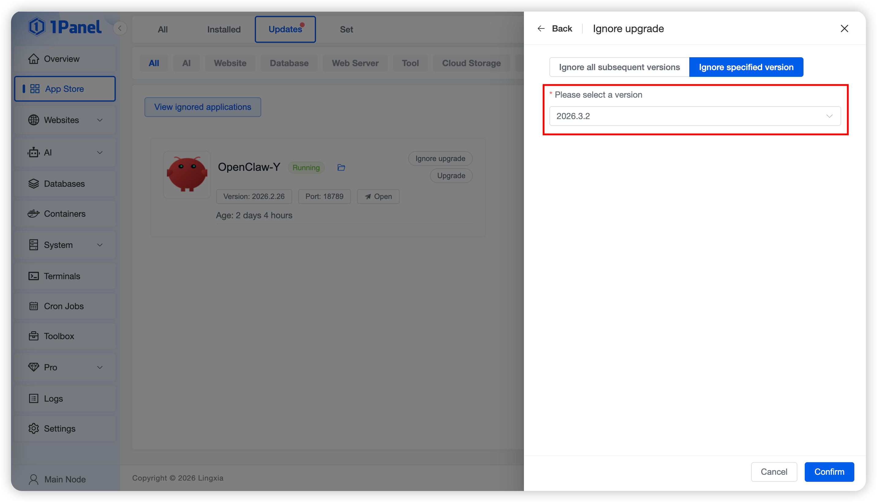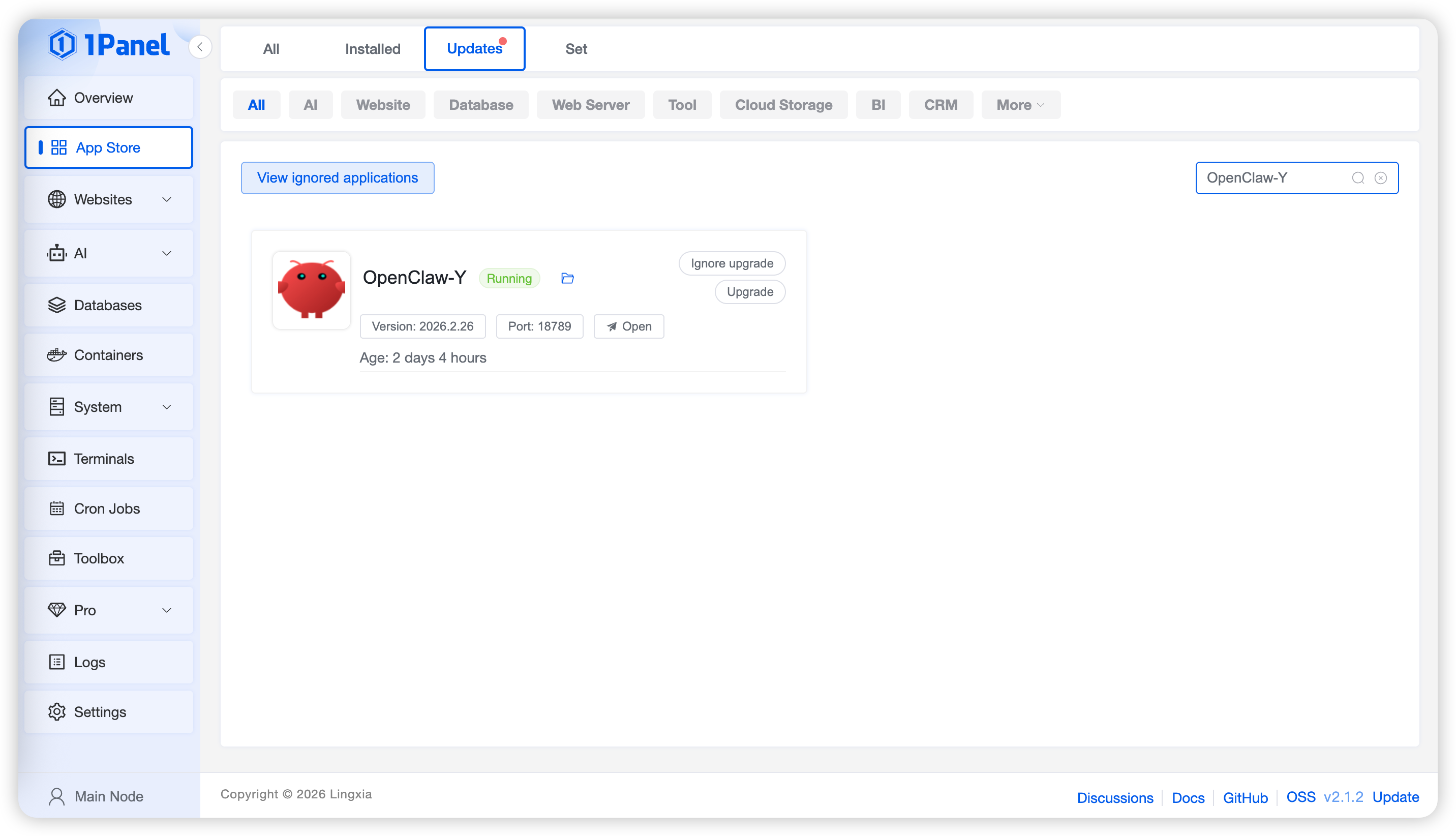 Click the Ignore Upgrade button on the application card to hide upgrade notifications for that application. You can view all ignored applications by clicking View Ignored Applications above the list and cancel the ignore.