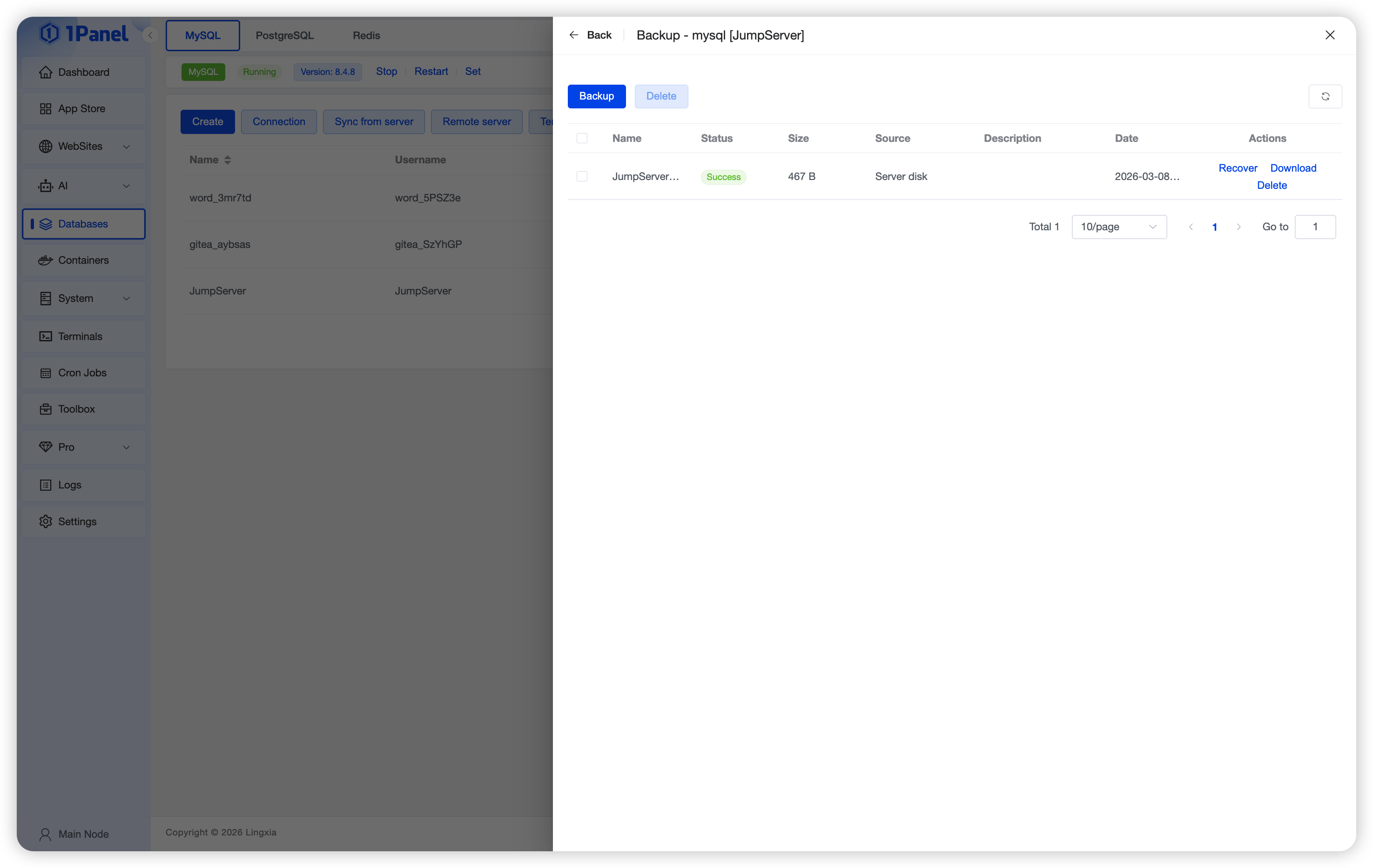 MySQL is a popular open-source relational database management system (RDBMS) suitable for various application scenarios. 1Panel provides visual installation and management capabilities, making deployment and maintenance easier.