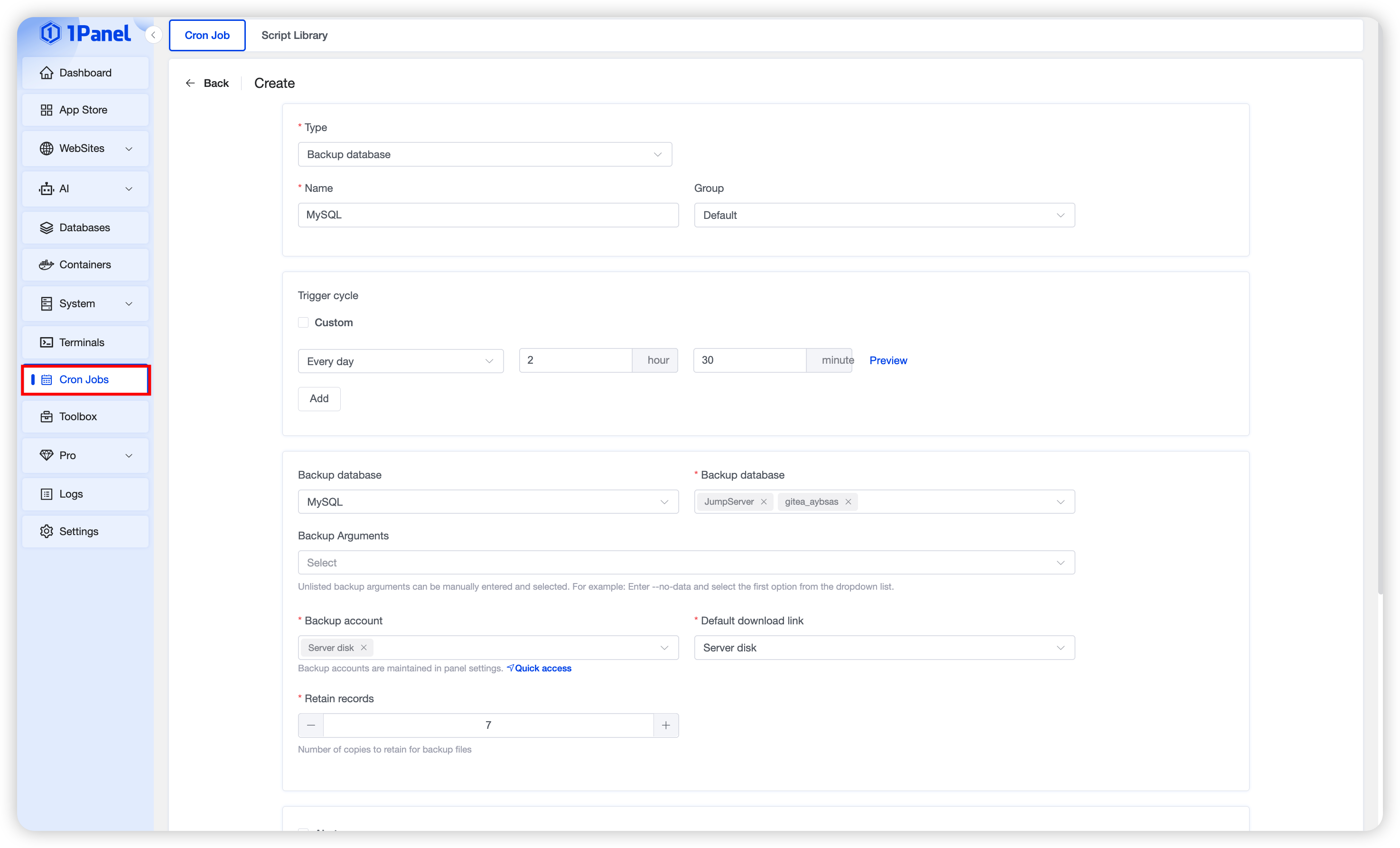 In Scheduled Tasks, select the Backup Database type to configure automatic scheduled backups for target databases.