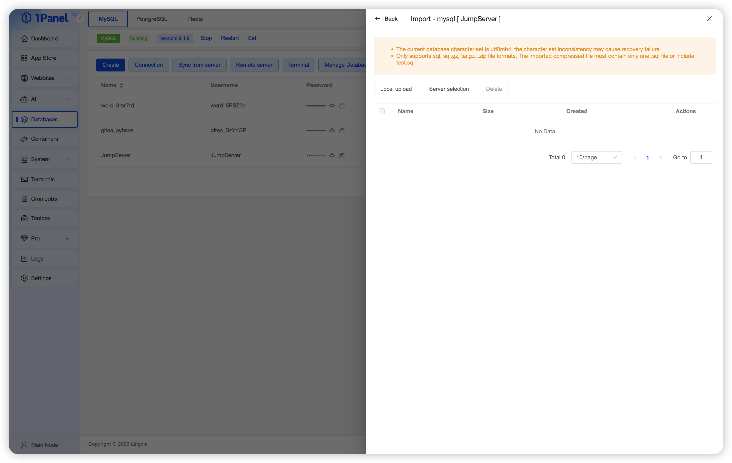 Supports Import Backup, allowing you to select Upload Local File or Existing Backup File on Server for import.