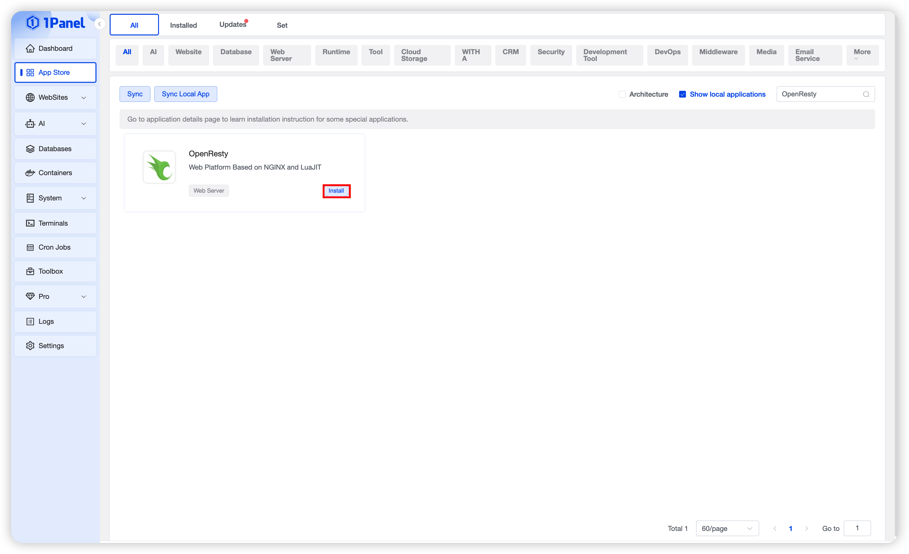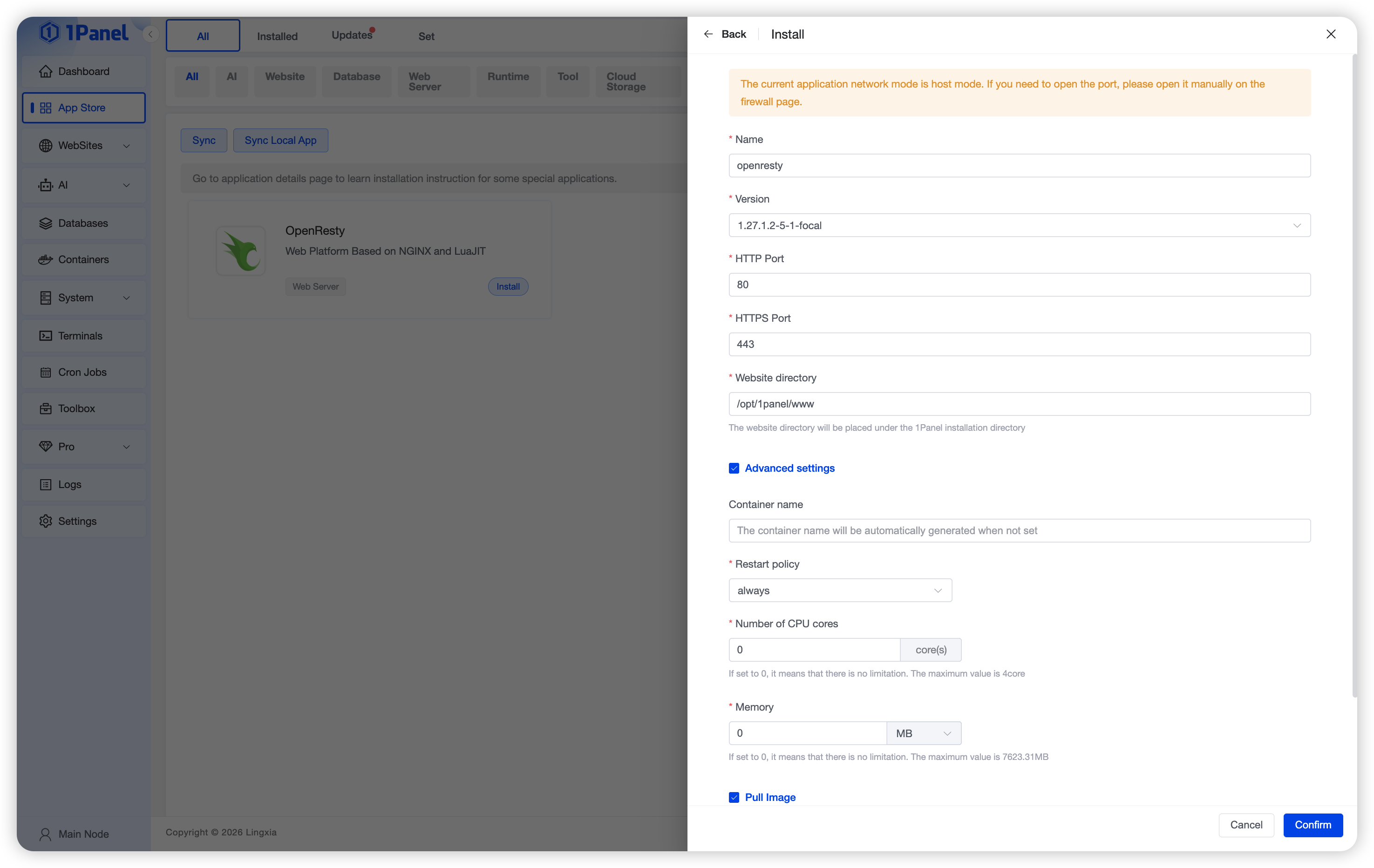 Install OpenResty Visually Using 1Panel¶