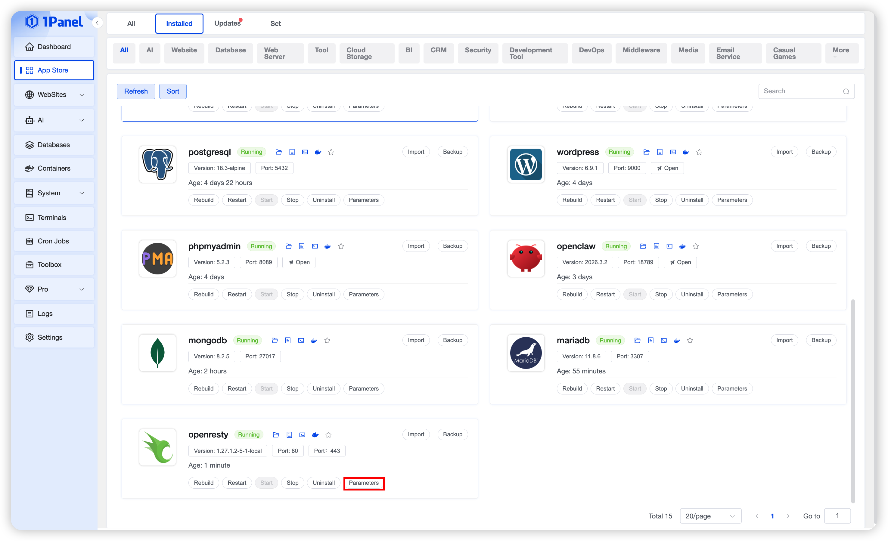 Go to the Installed page to view the running status of OpenResty. You can perform the following operations on the application: