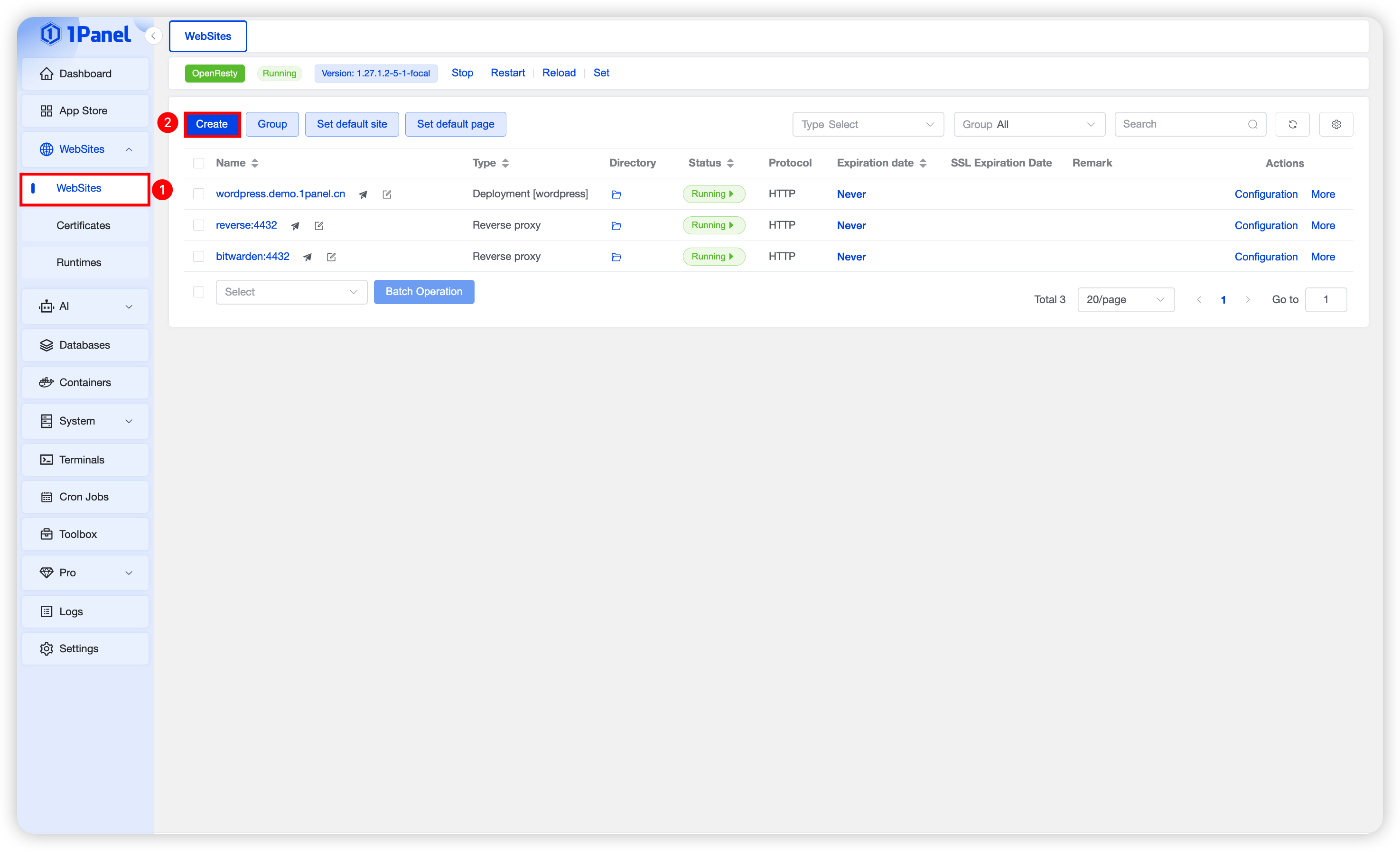Go to the Websites menu on the left side of 1Panel to create new websites and use the OpenResty service.