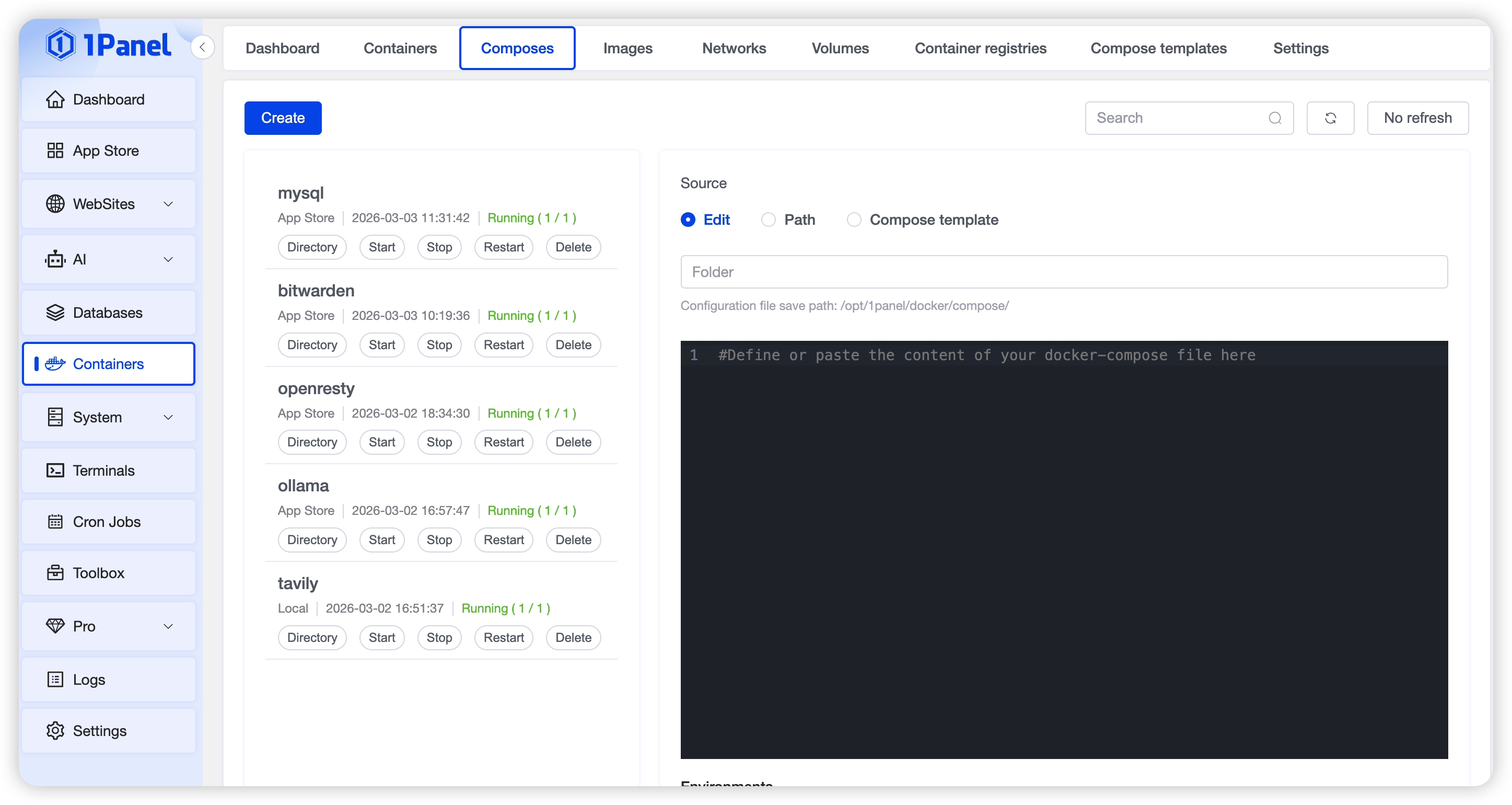 - Path Selection: Select an existing docker-compose.yml file in the 1Panel service
