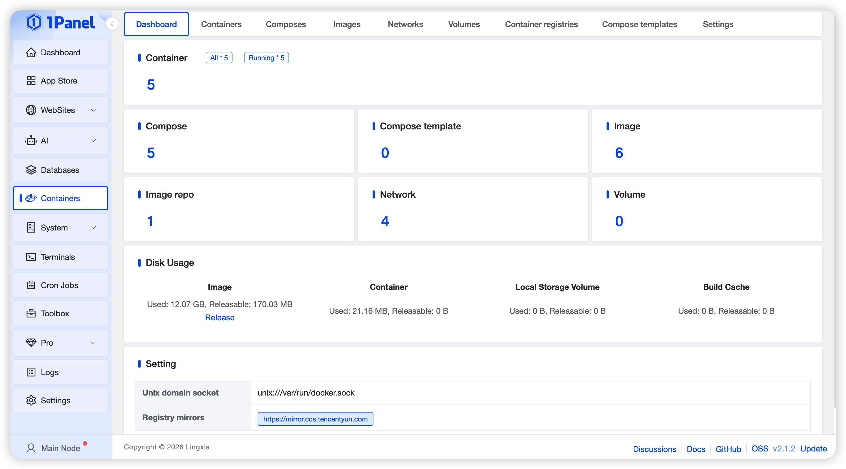 On the container overview page, you can view the overall status of the container service on the current server, including the number of containers, orchestrations, images, networks, volumes, and basic configuration information of the container service.