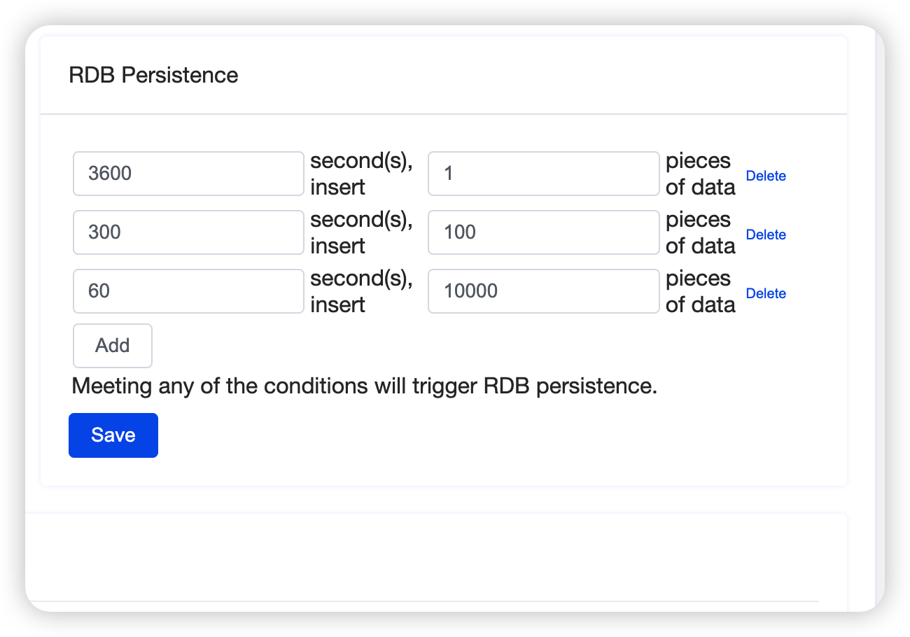 Set the persistence policy. RDB persistence is triggered when any of the conditions are met.