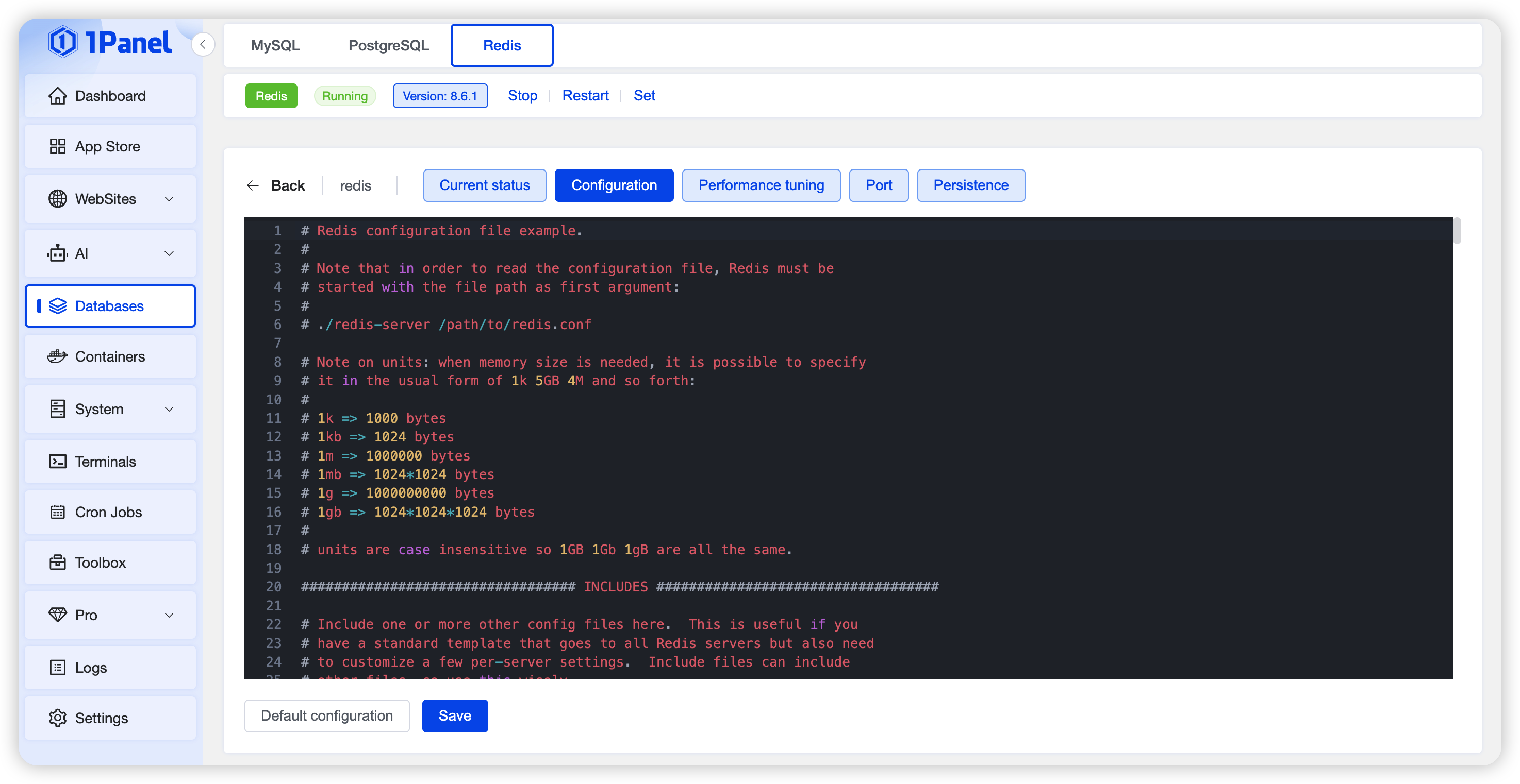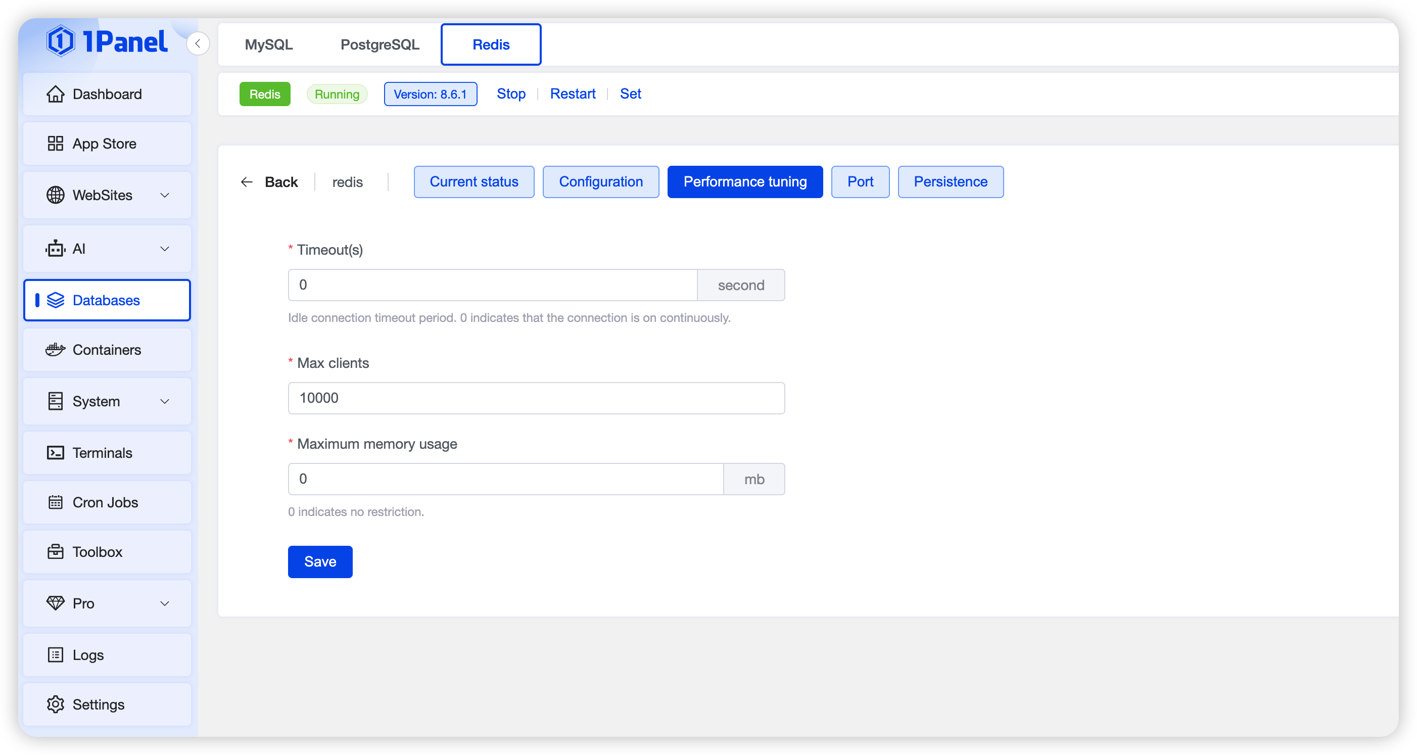 Warning: Incorrect configuration may make Redis unavailable; modify with caution. If the service fails to start due to invalid configuration, restore the default settings and save.