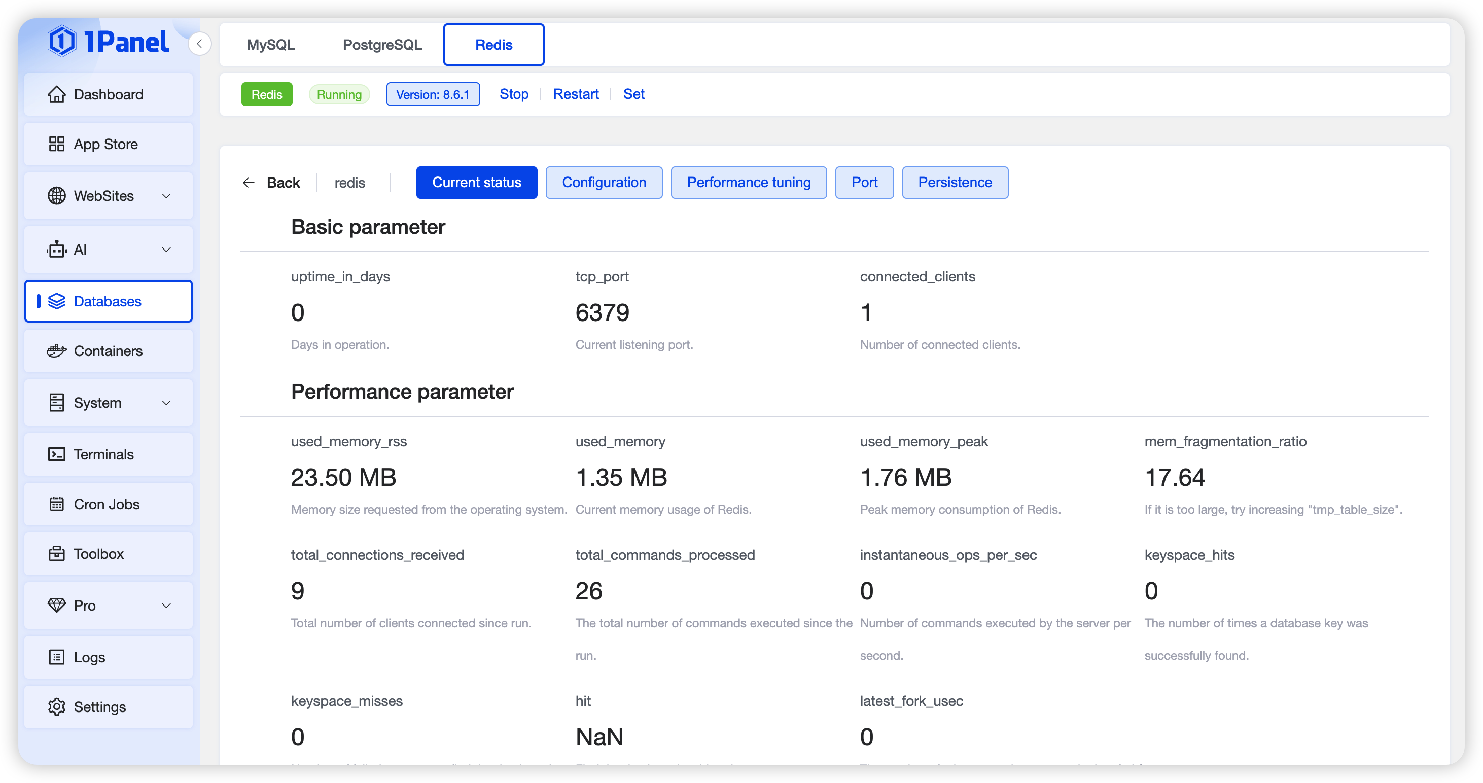 When Redis queries are slow, you can go to the settings interface and click Current Status to view key metrics such as memory allocation and query hit ratio for performance optimization.