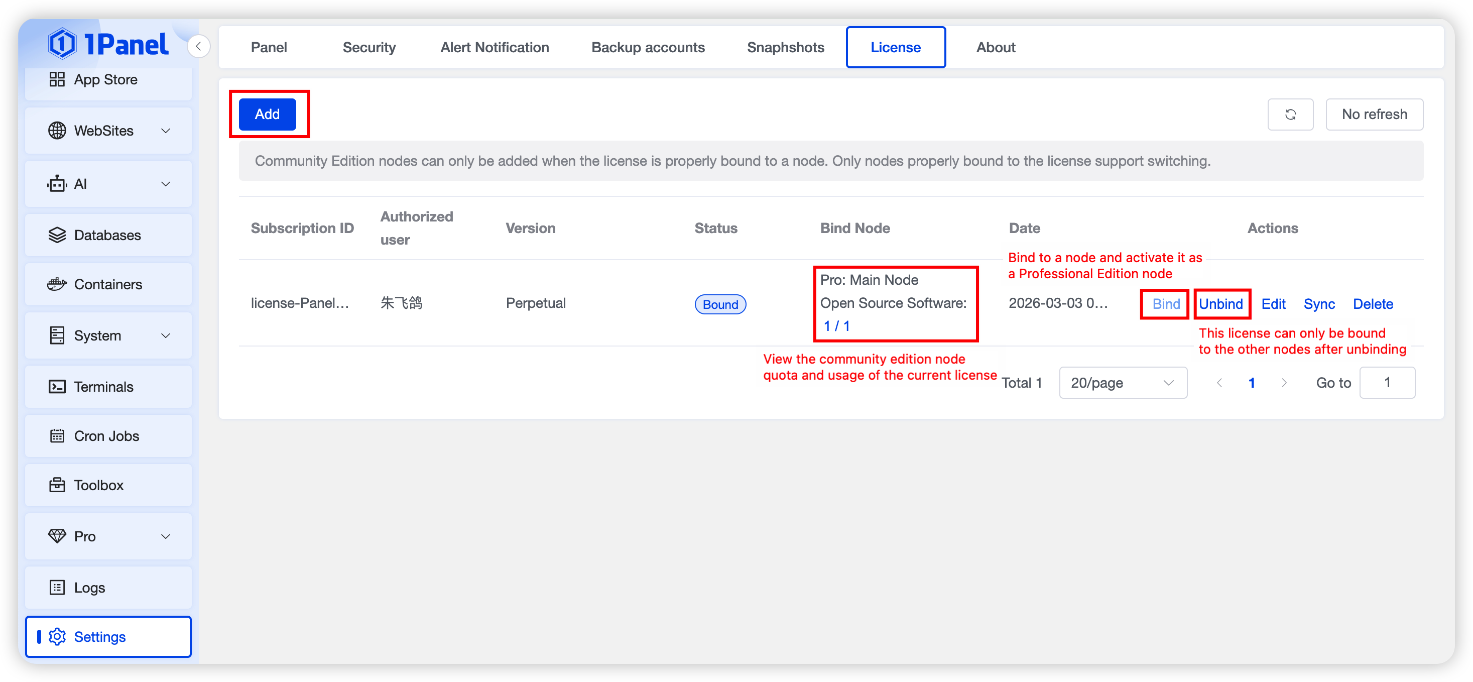View license status and import Pro licenses. Each Pro license can activate: - 1 Pro node - Multiple Community nodes