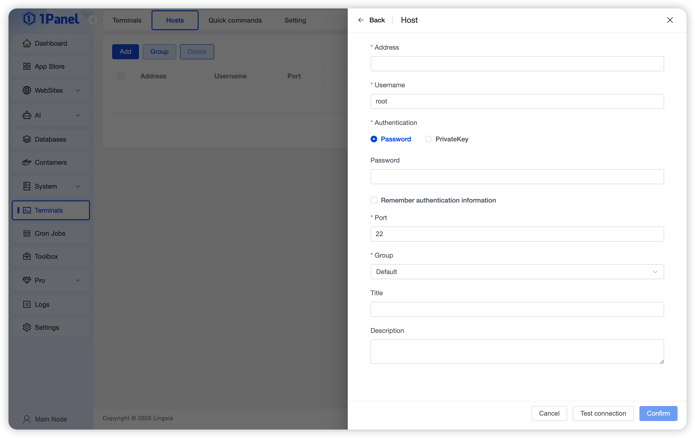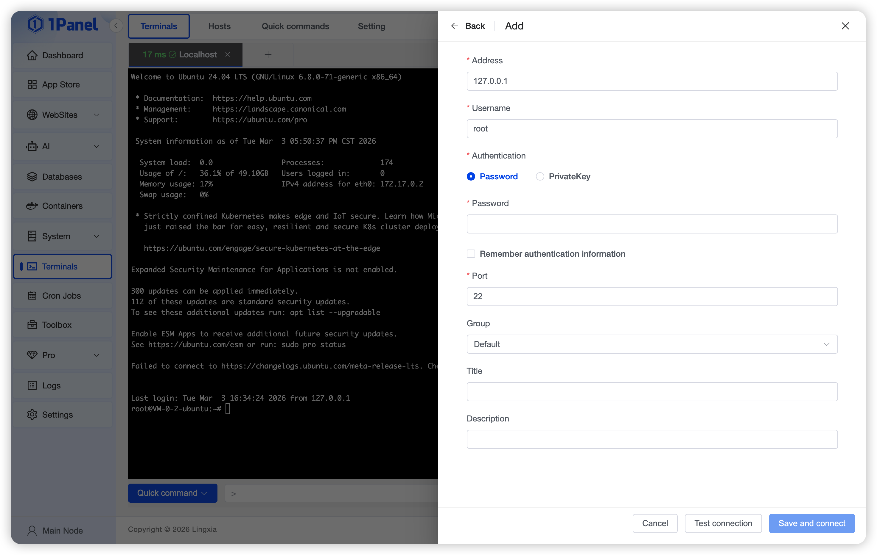 Go to Host → Terminal to open the terminal page. The terminal connects to the local server by default; connection fails if local login credentials are not set.