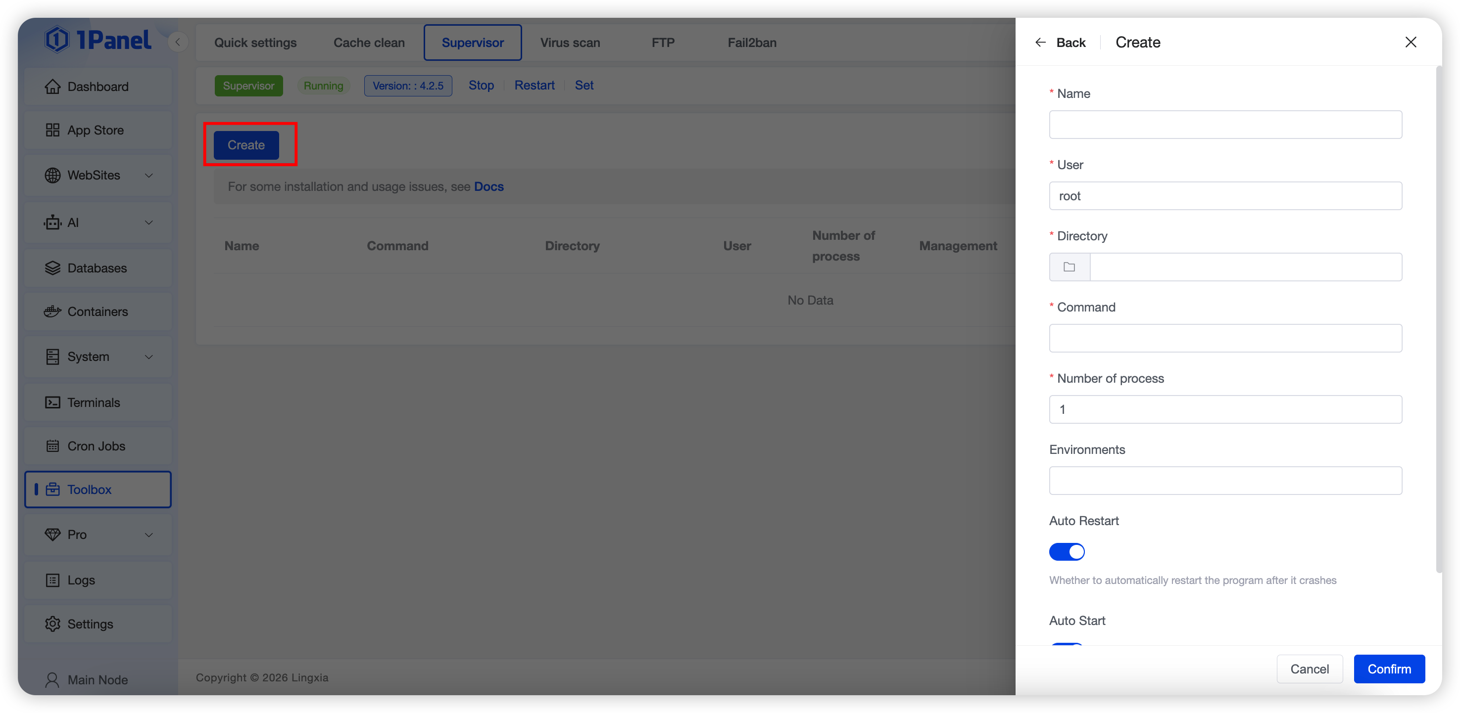 You can manage daemons on the list page: start, stop, restart, view logs, edit, delete, modify source files, etc.