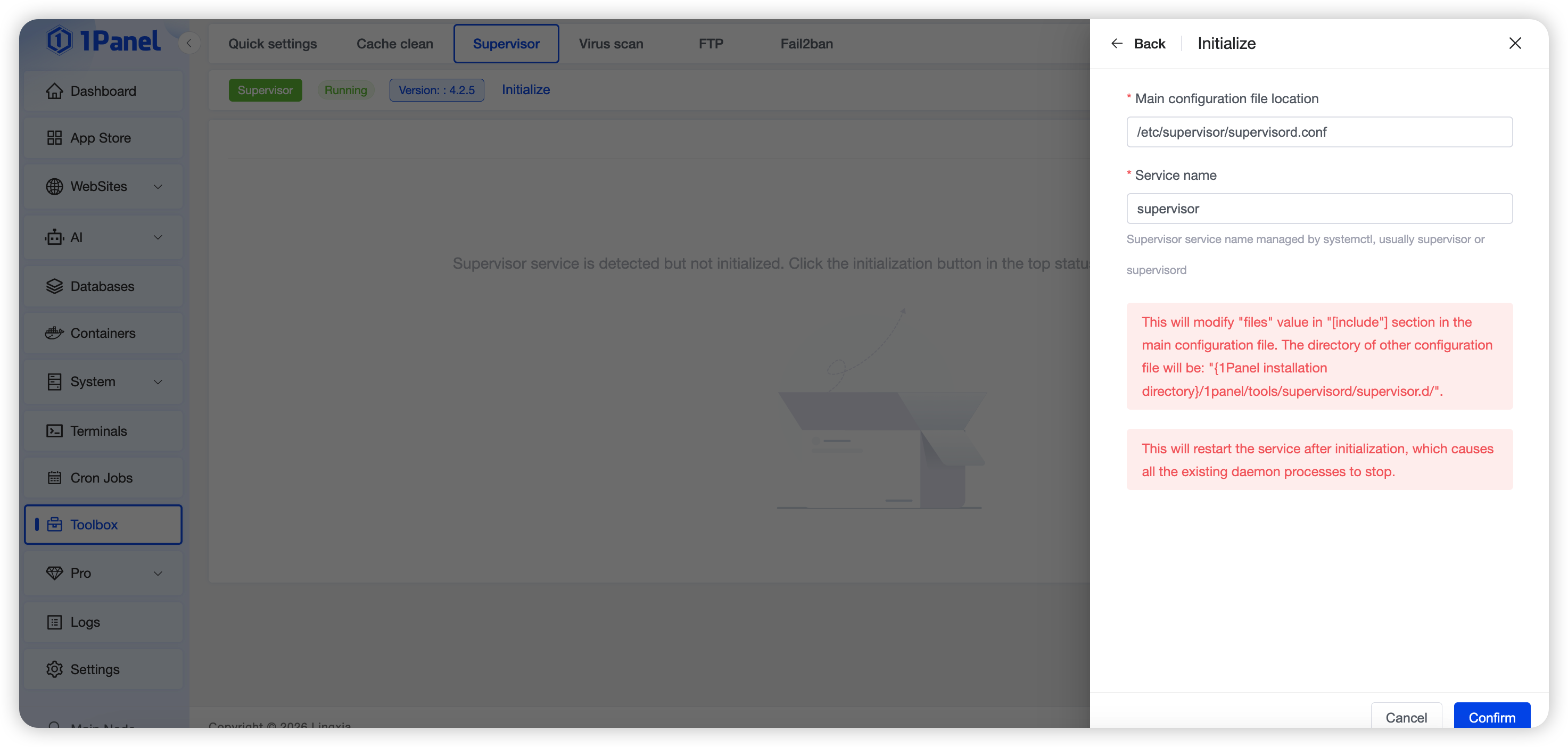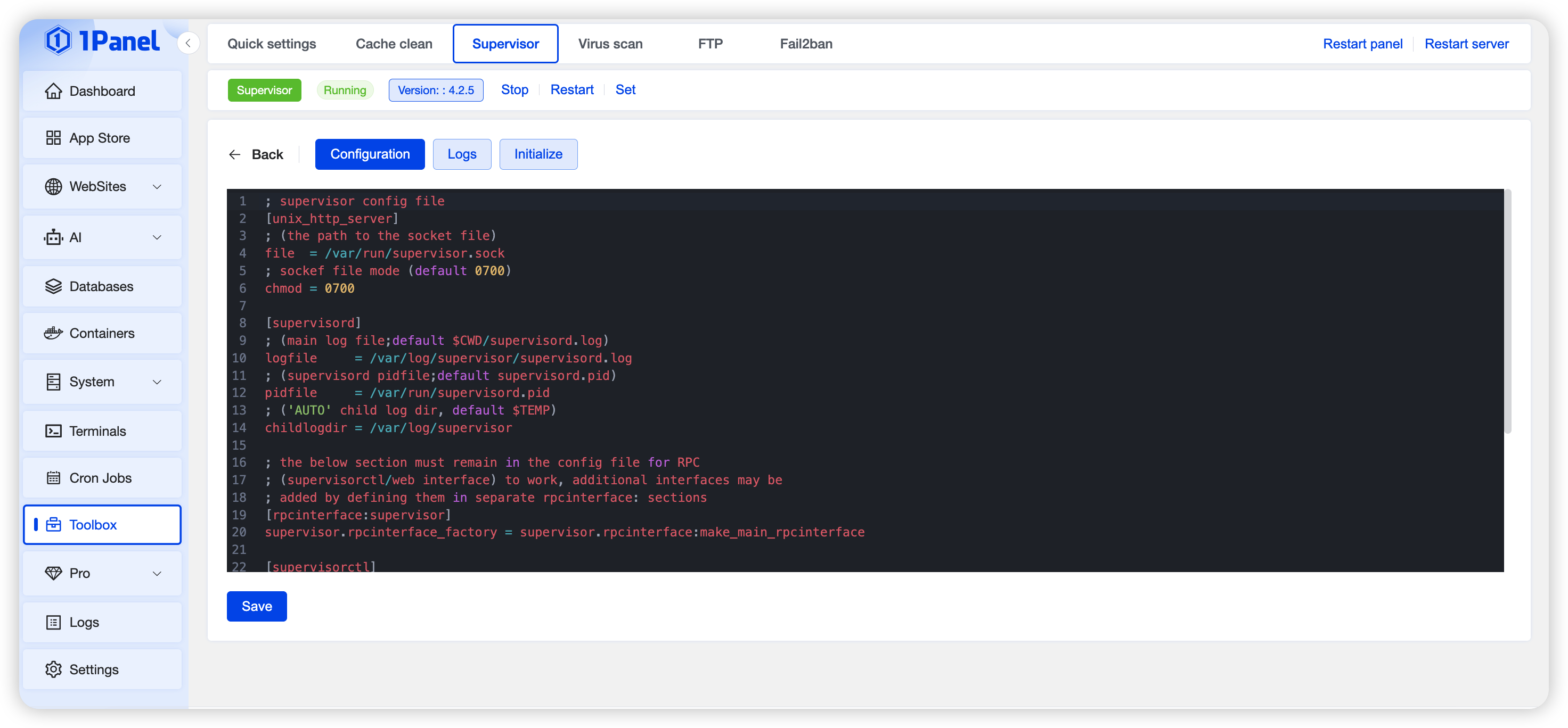 On the Supervisor status bar, you can restart/stop the Supervisor service, view logs, edit configuration, etc.