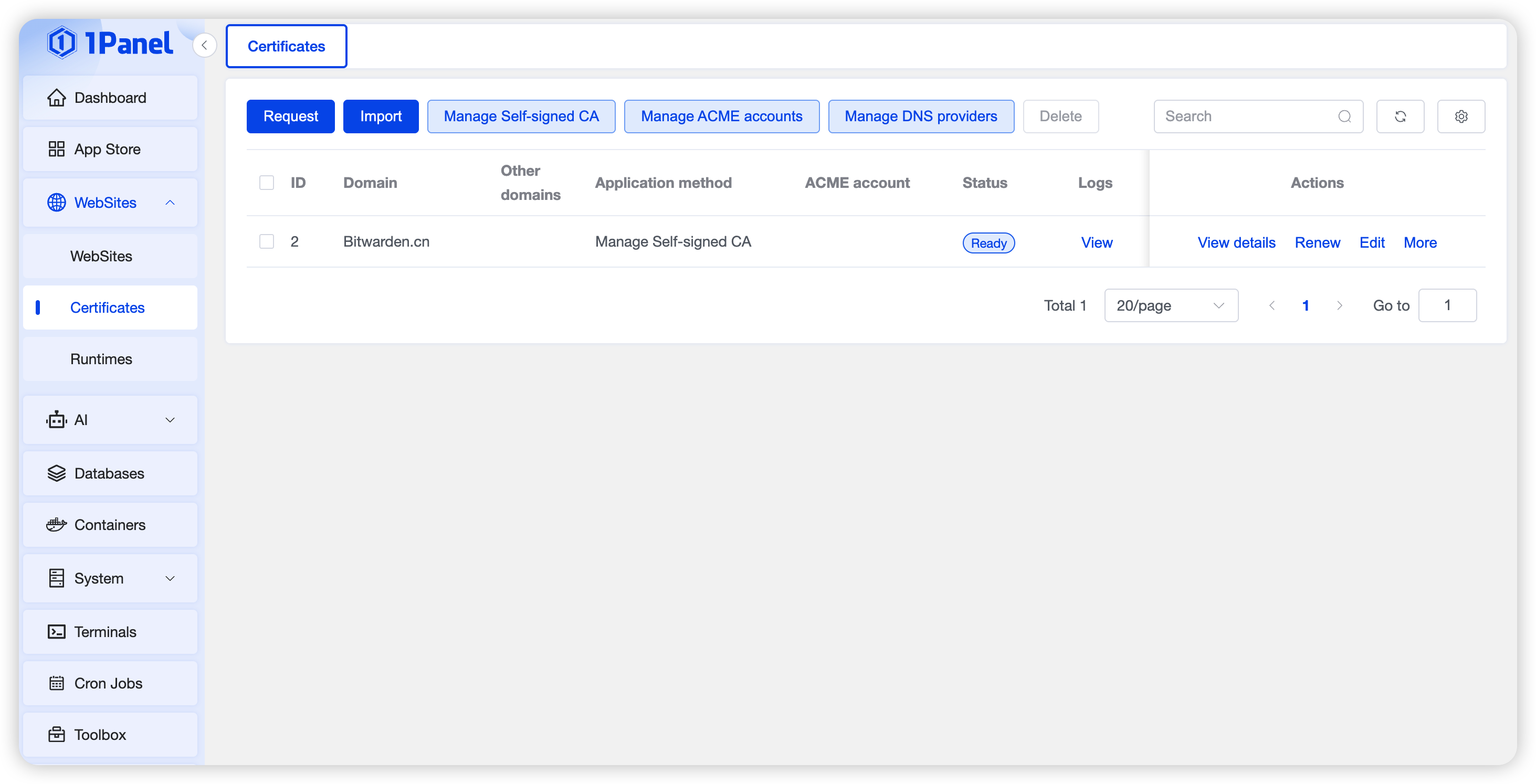 Manage certificates, including applying for certificates, renewing certificates, ACME account management, DNS account management, etc.