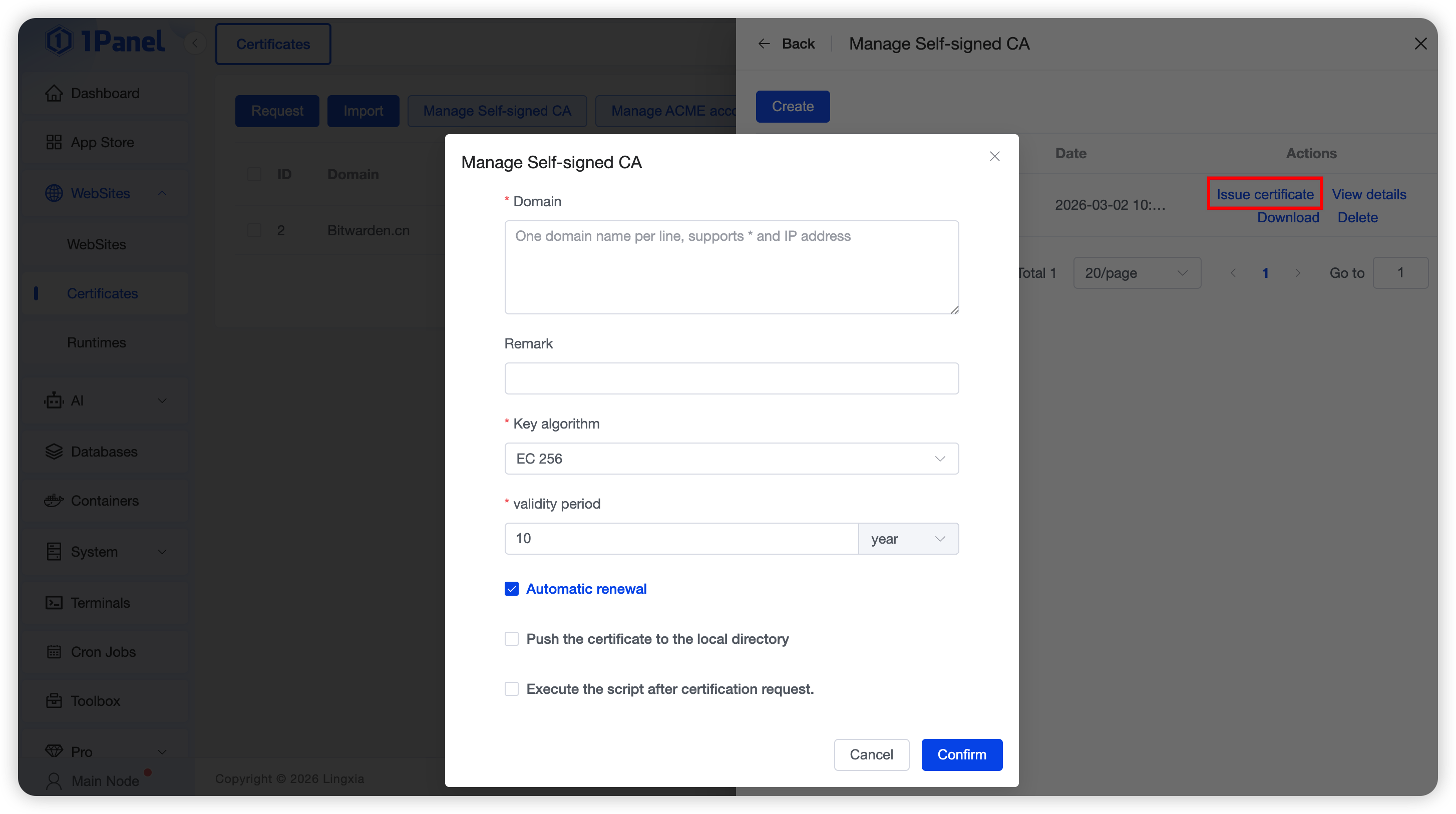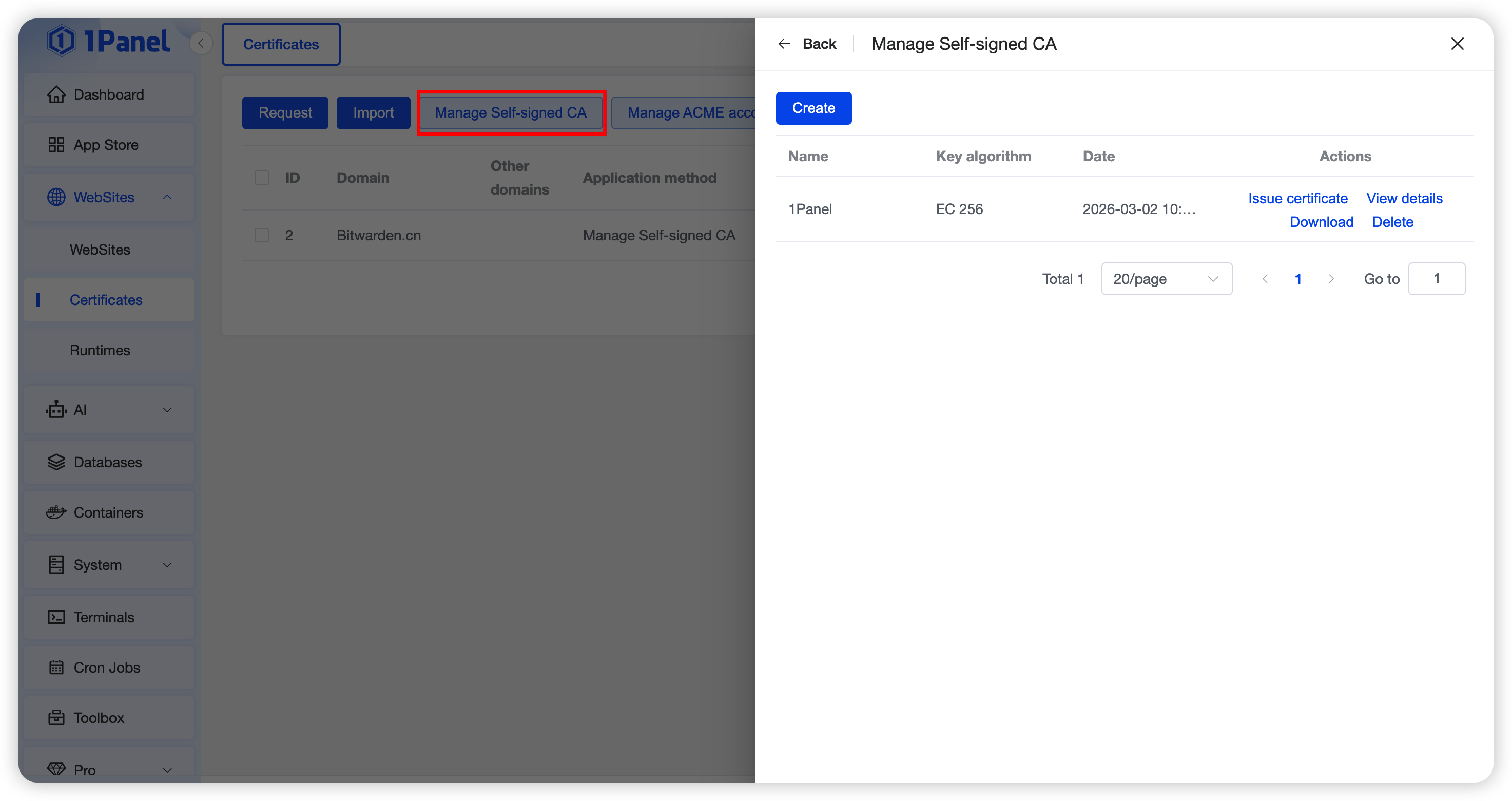 1Panel creates a default certificate authority named 1Panel. You can use it to quickly create self-signed certificates if you have no special requirements.