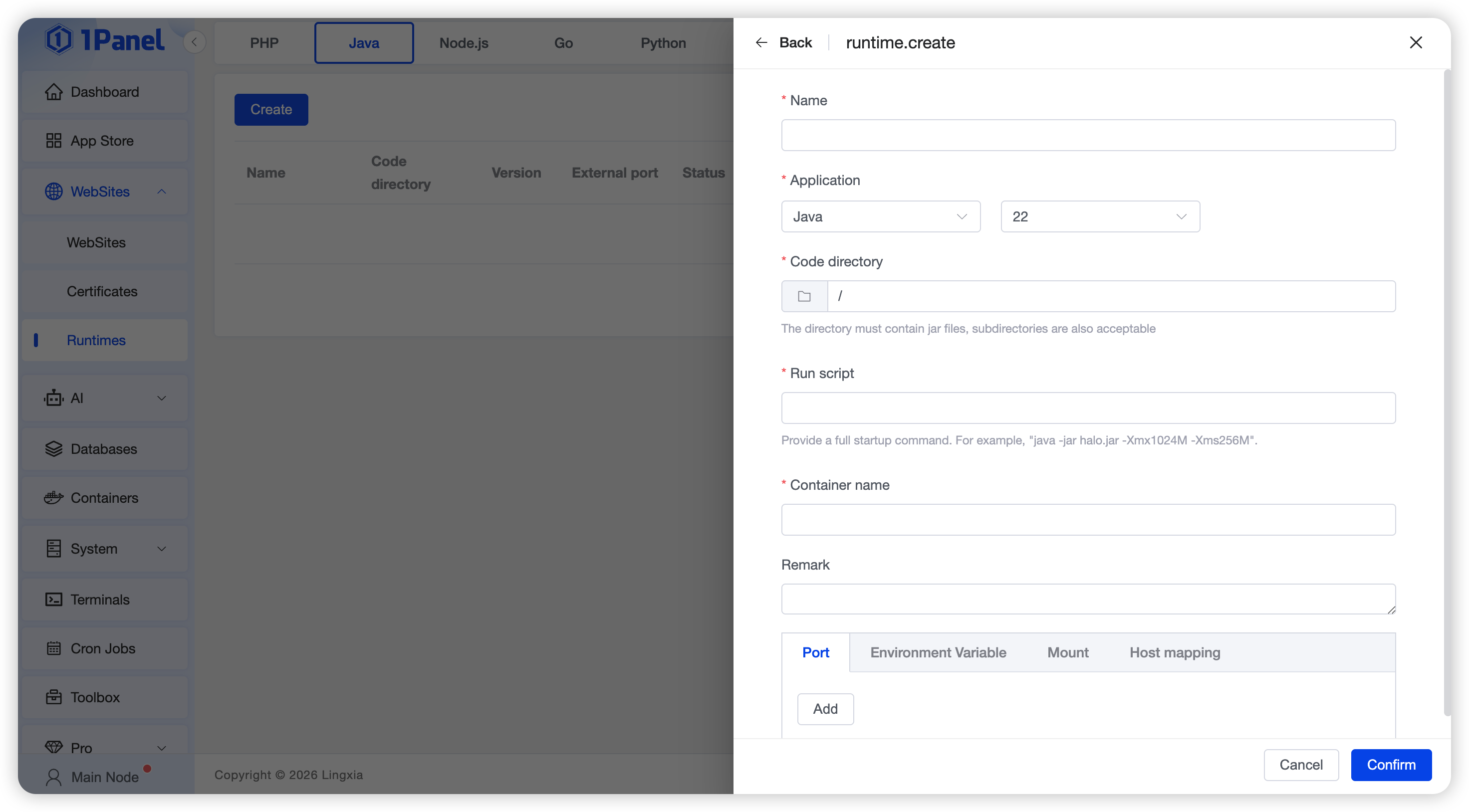 Click the Create Runtime Environment button and select the Java version, runtime directory, and other information.
