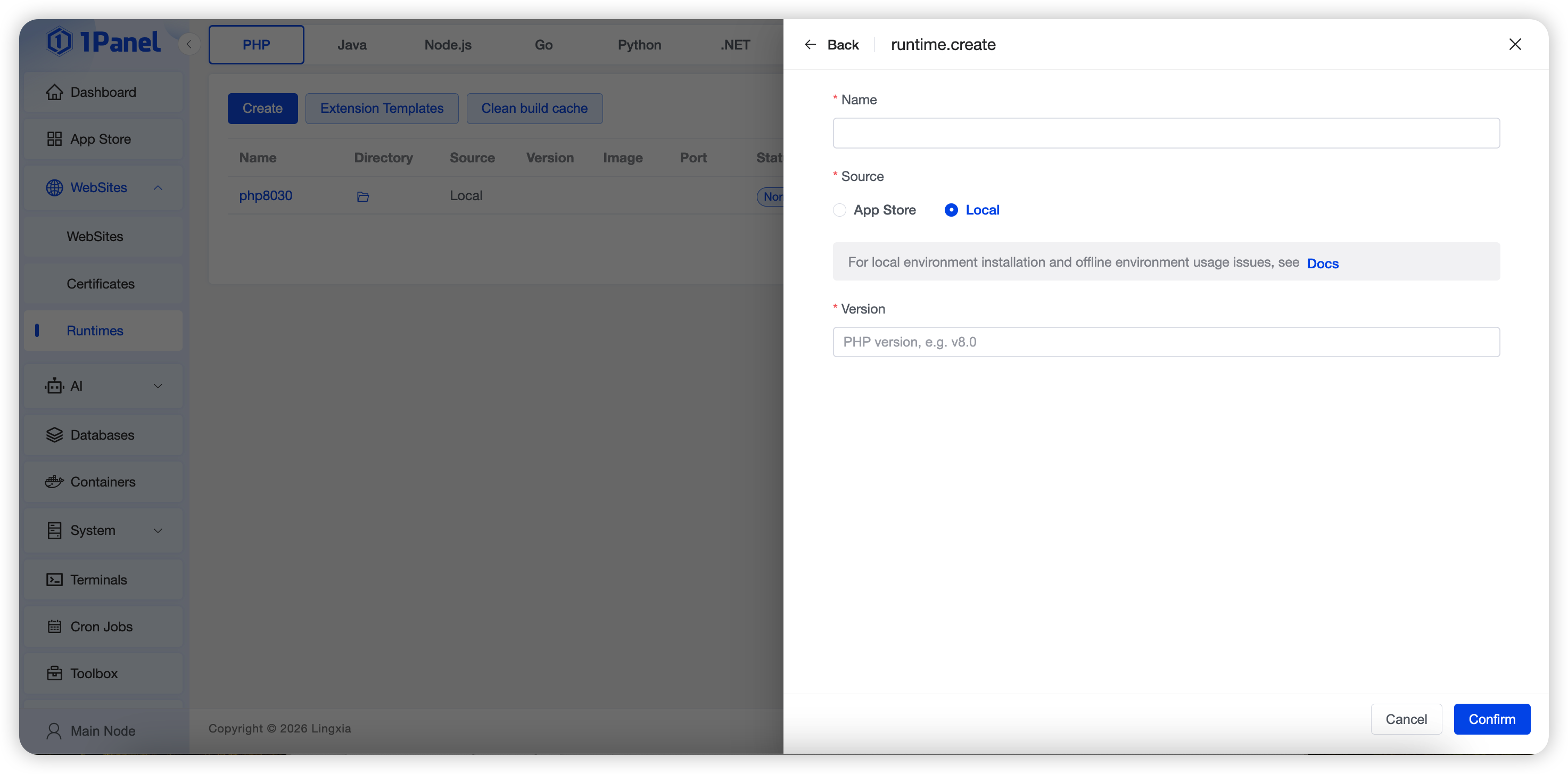 /opt/1panel/runtime/php/[php_name]directory and images from another 1Panel server, upload them to the offline 1Panel server, and start with thedocker compose upcommand. Remember the mapped port. - Create a website with the runtime environment, select the newly created PHP runtime environment, and modify the port to the one just started.