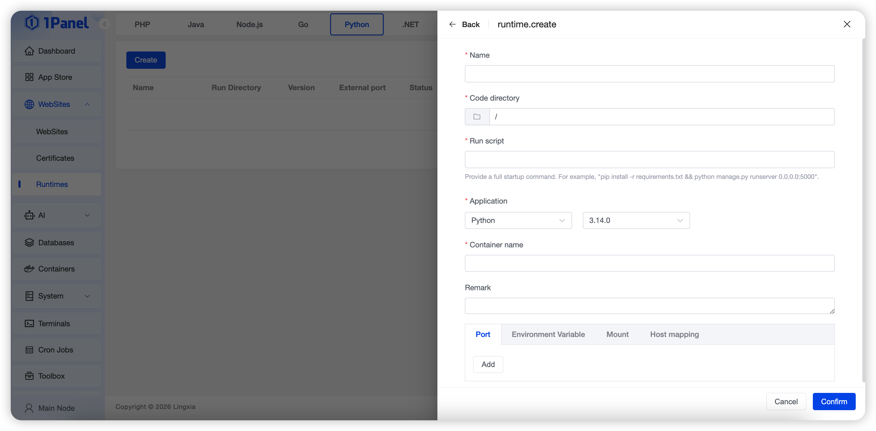 Click the Create Runtime Environment button and select the Python version, runtime directory, and other information.