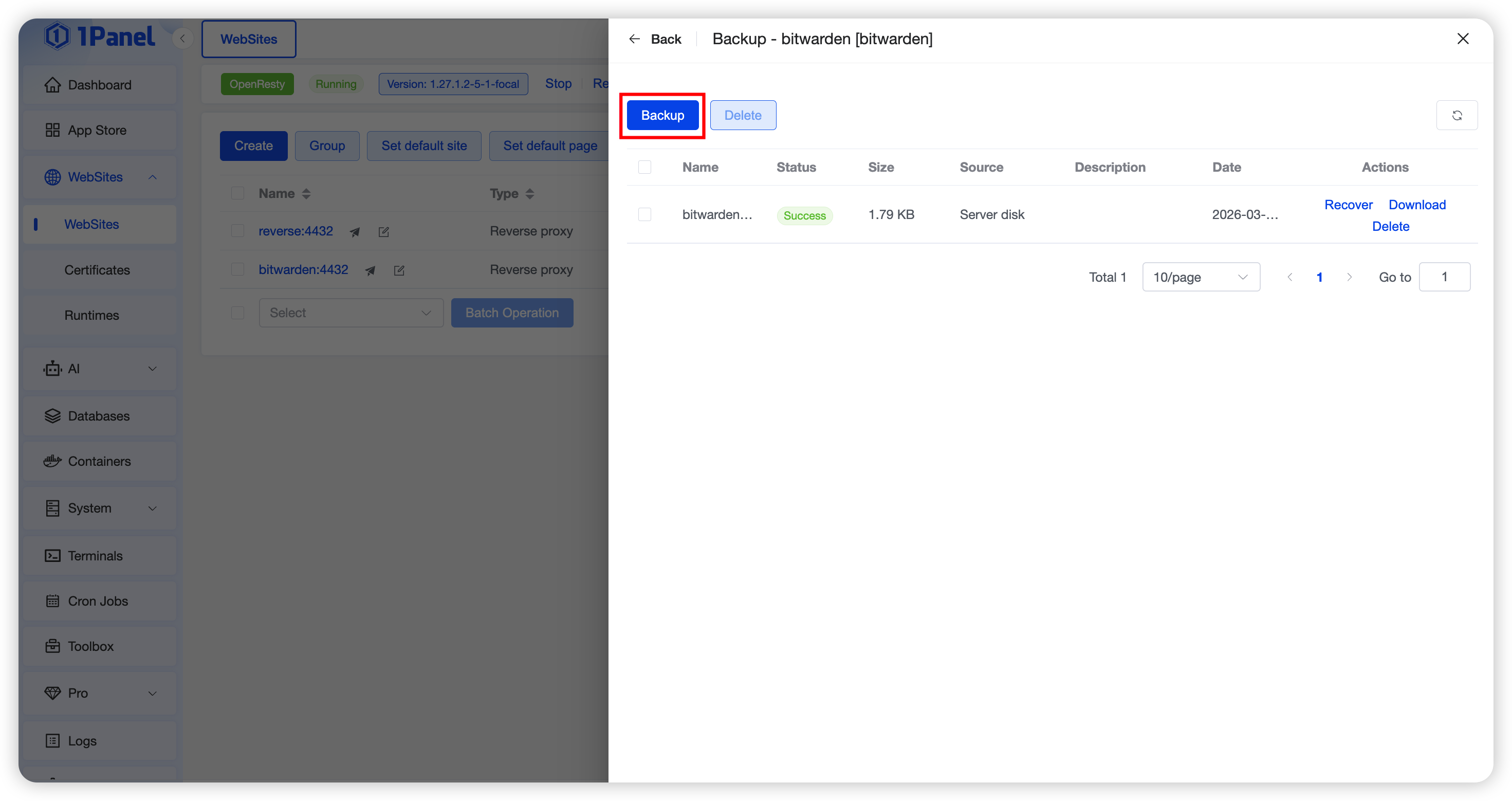 Click Backup List in the More menu of the website list. The system will generate a backup file in the default backup directory.