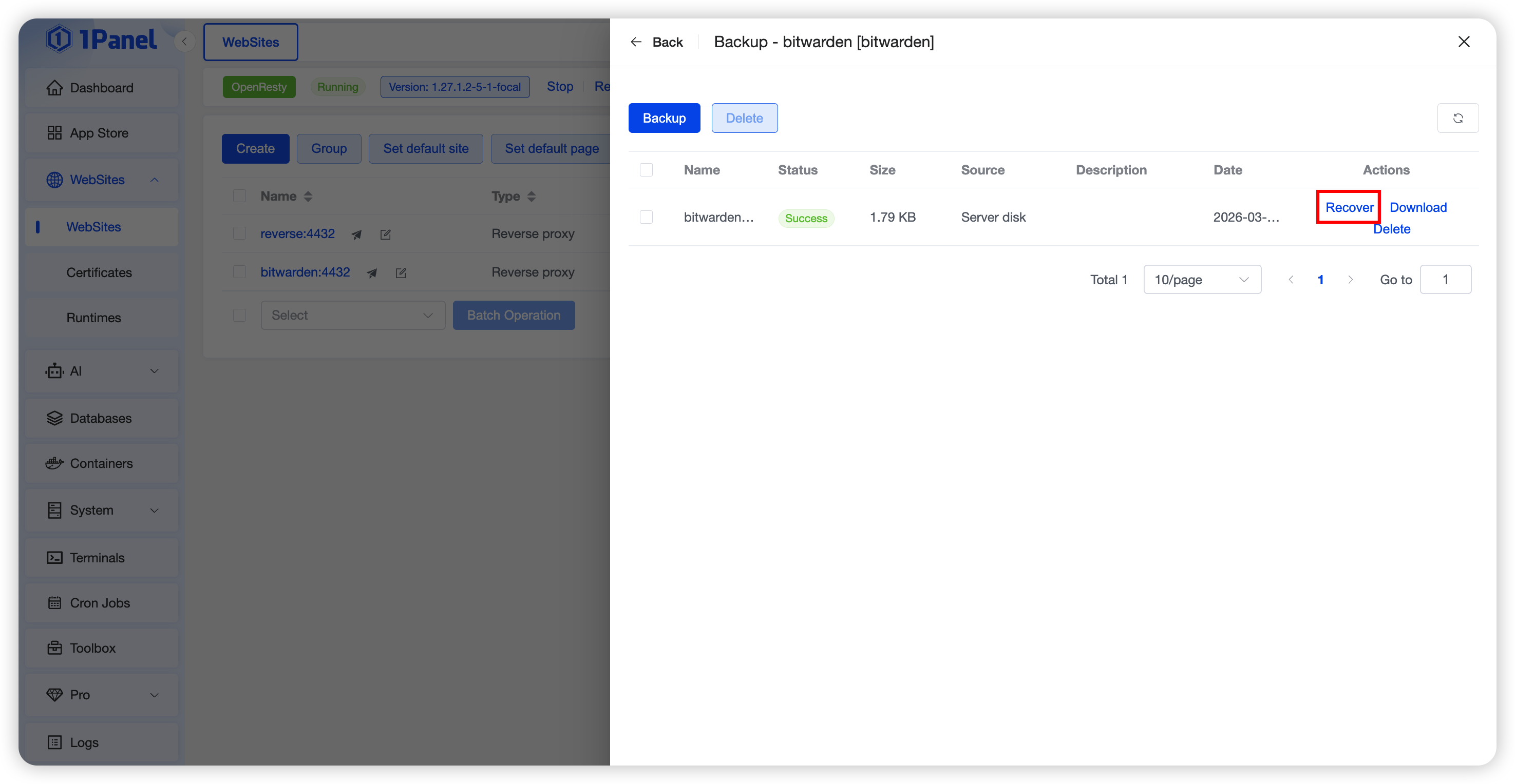 Select the target backup record in the backup list and click Restore to perform the restoration.