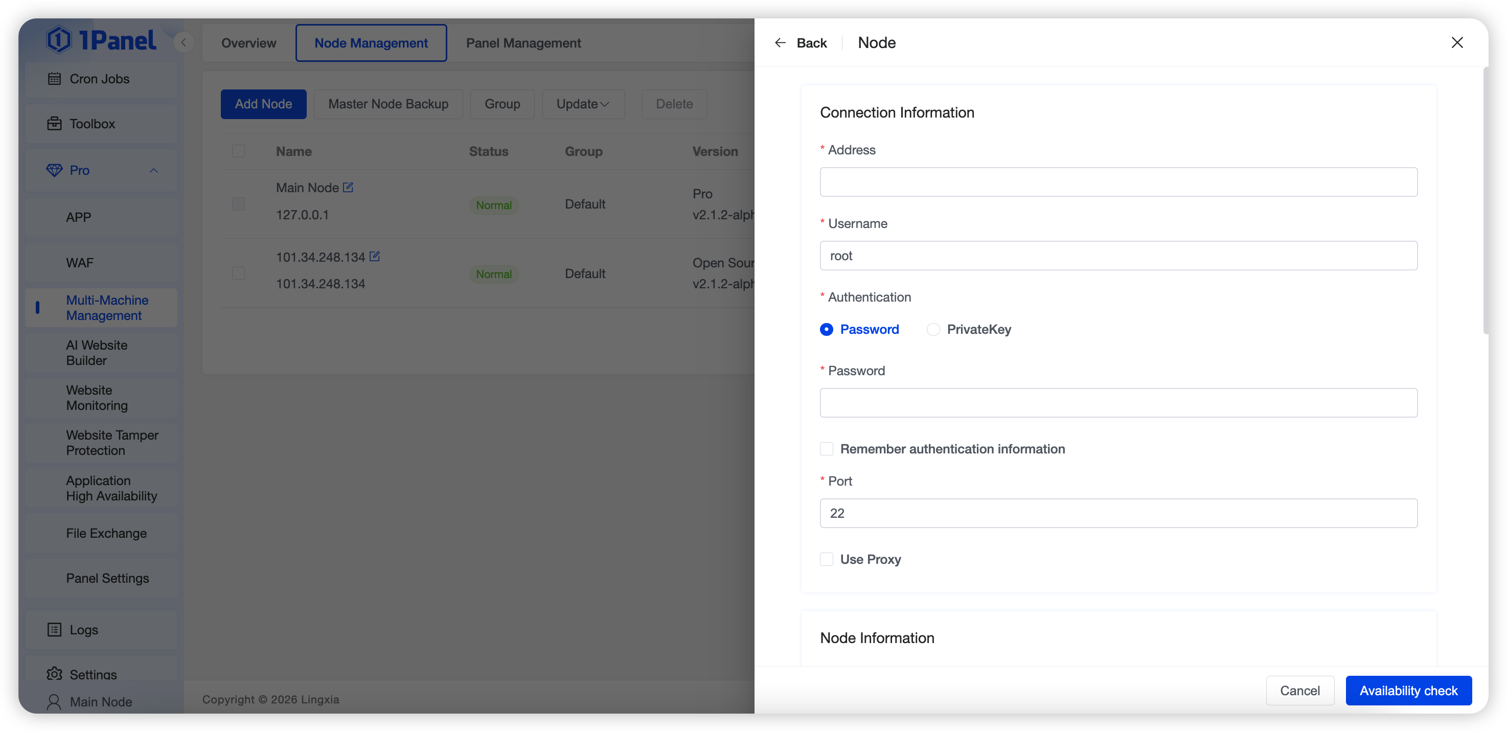 Before adding a node, an availability check verifies network connectivity and authentication validity. Only nodes that pass the check can be added successfully.
