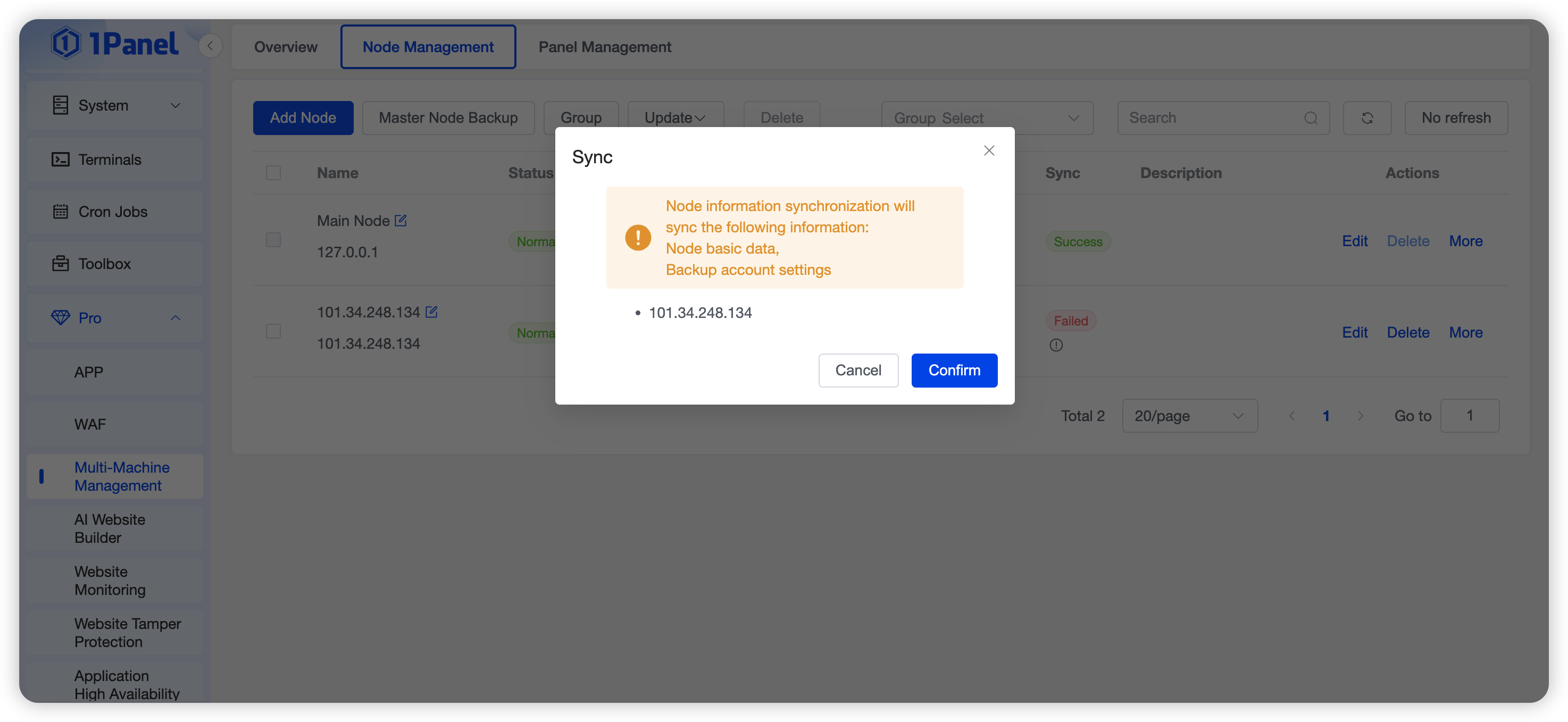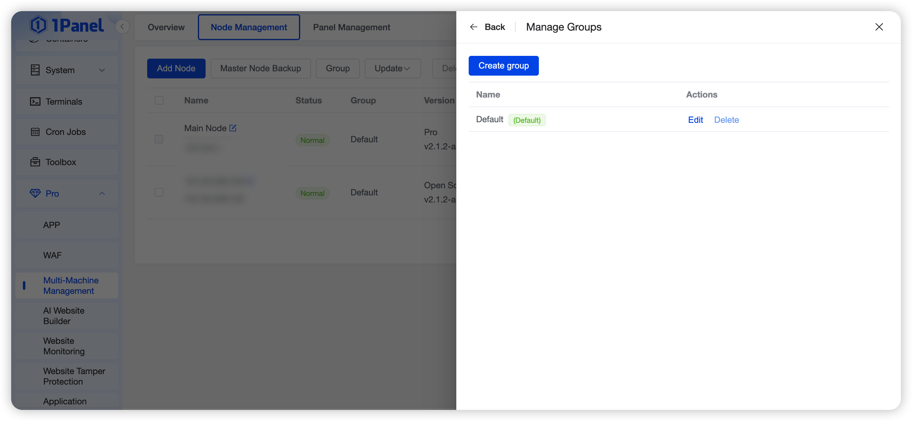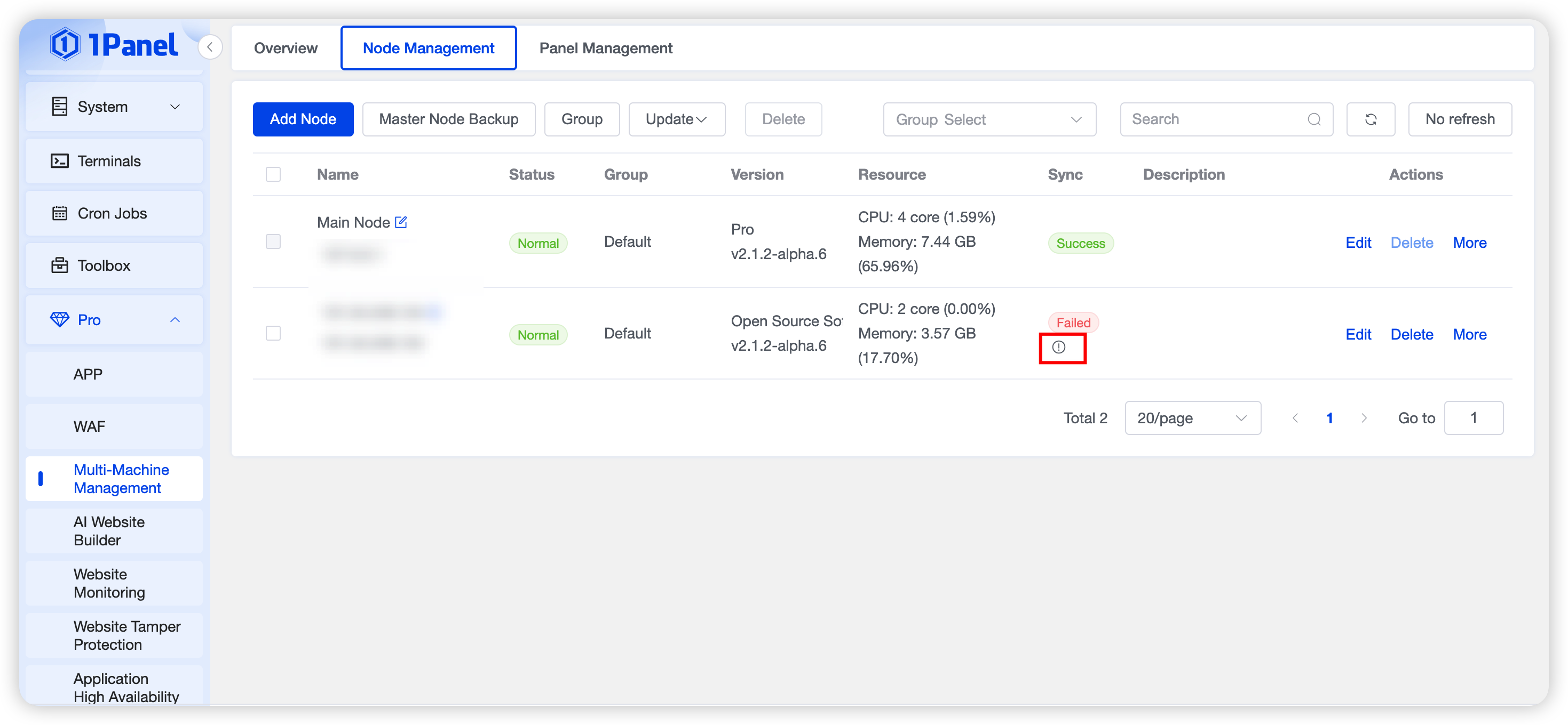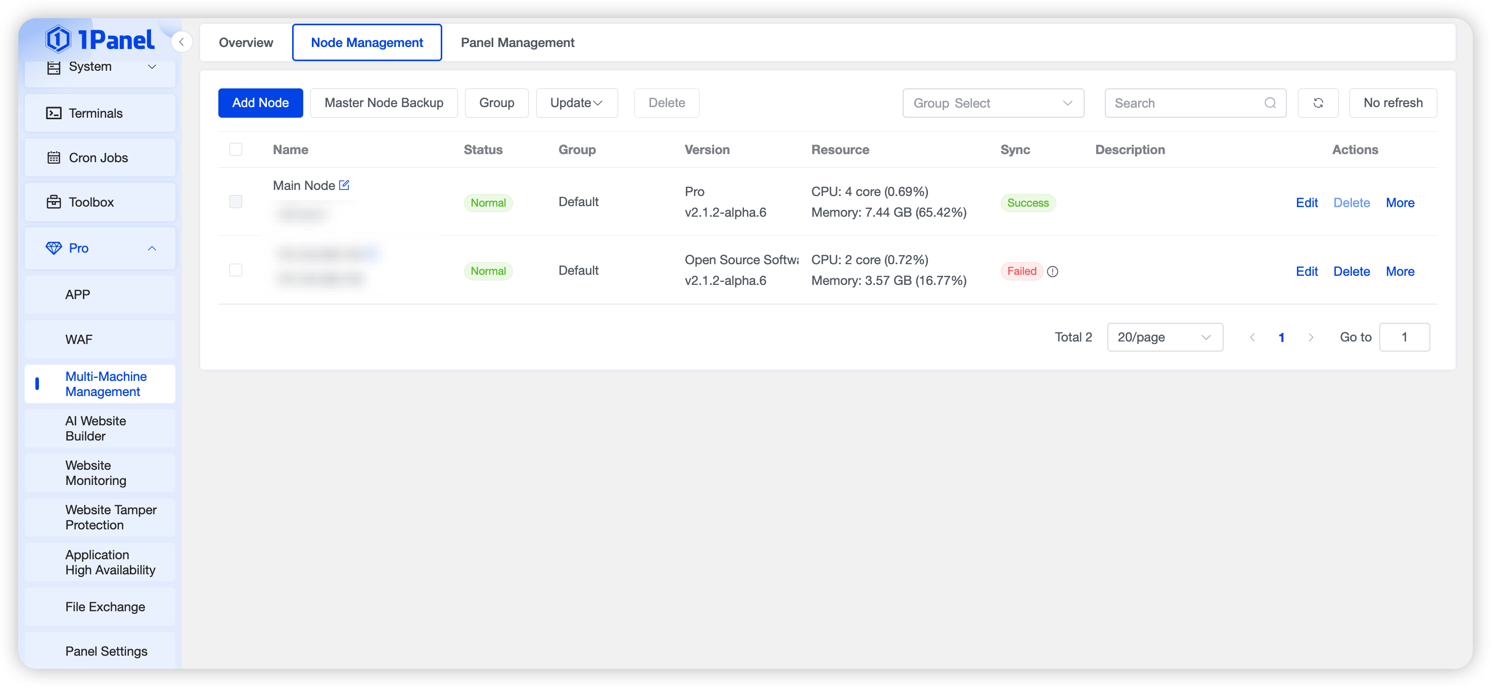 💎 Pro Edition Feature: Node Management is exclusive to 1Panel Pro Edition, supporting advanced features such as multi‑node switching, unified monitoring, batch updates, and file transfer between nodes.