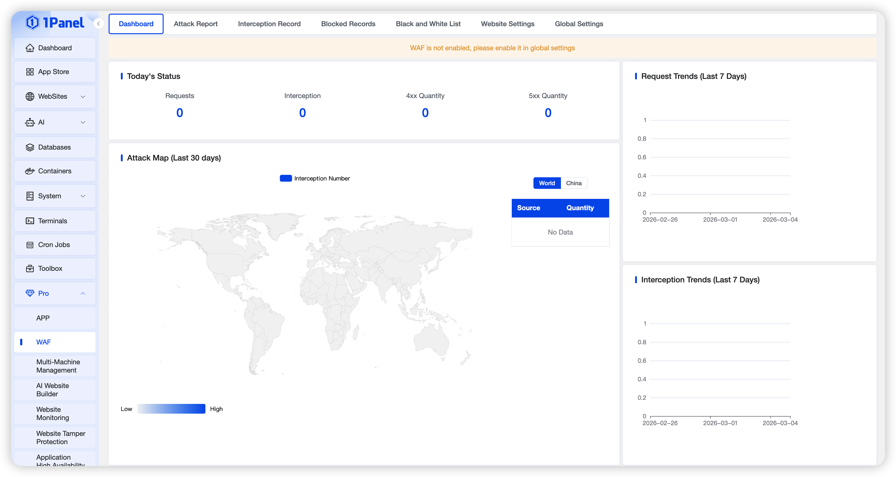 On the Overview page, you can view today’s status, attack map, request trends, and block trends.