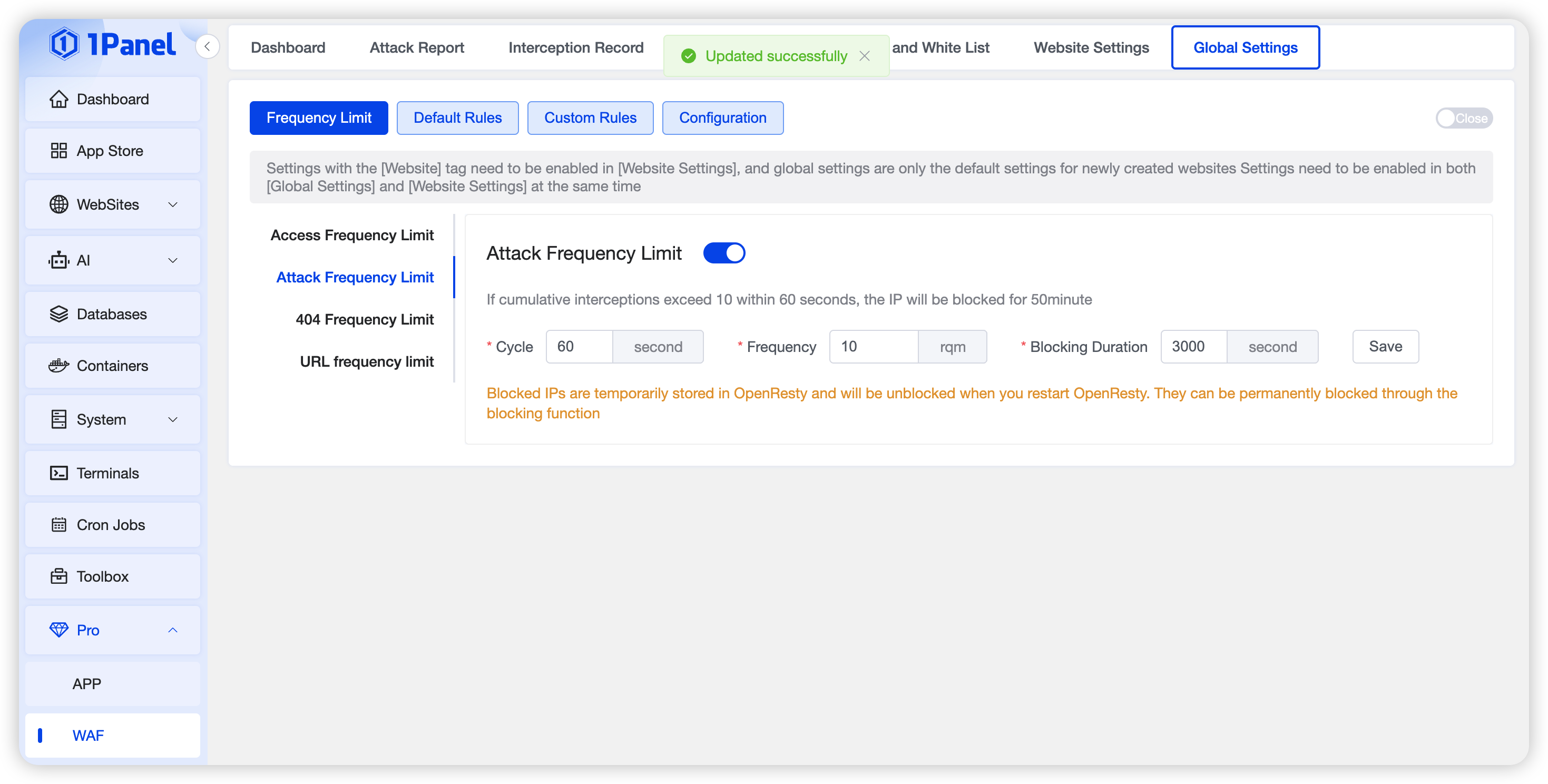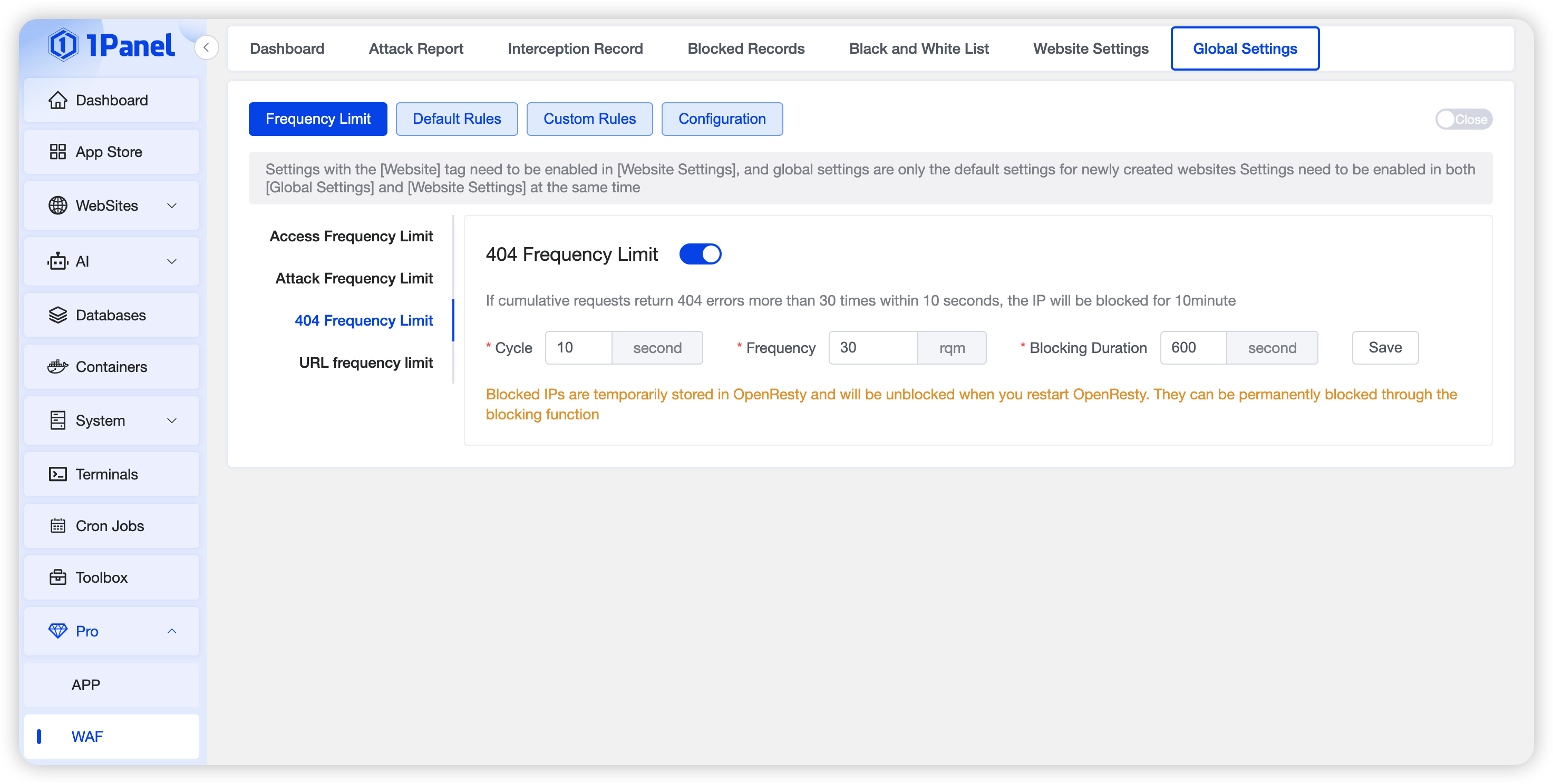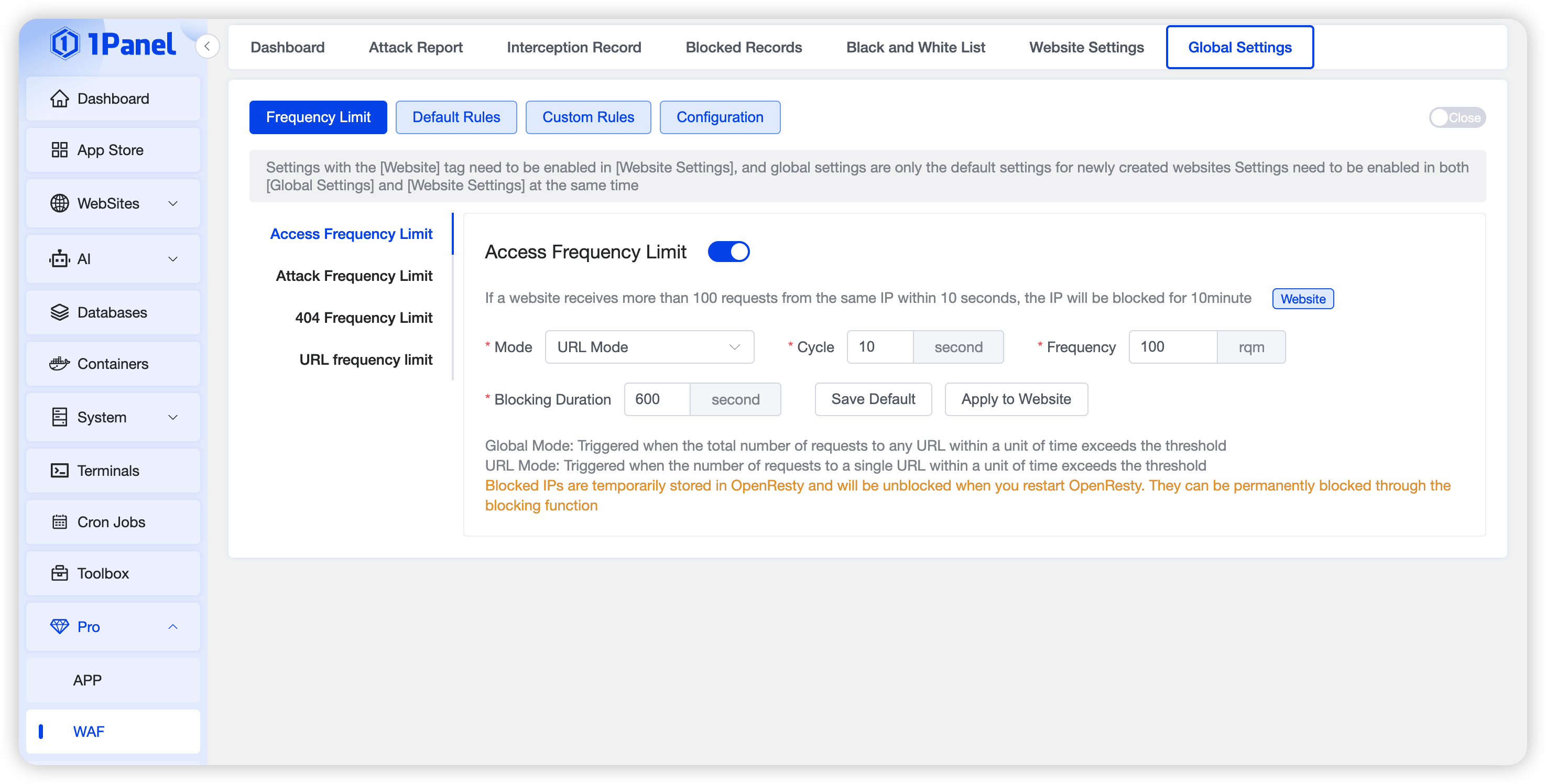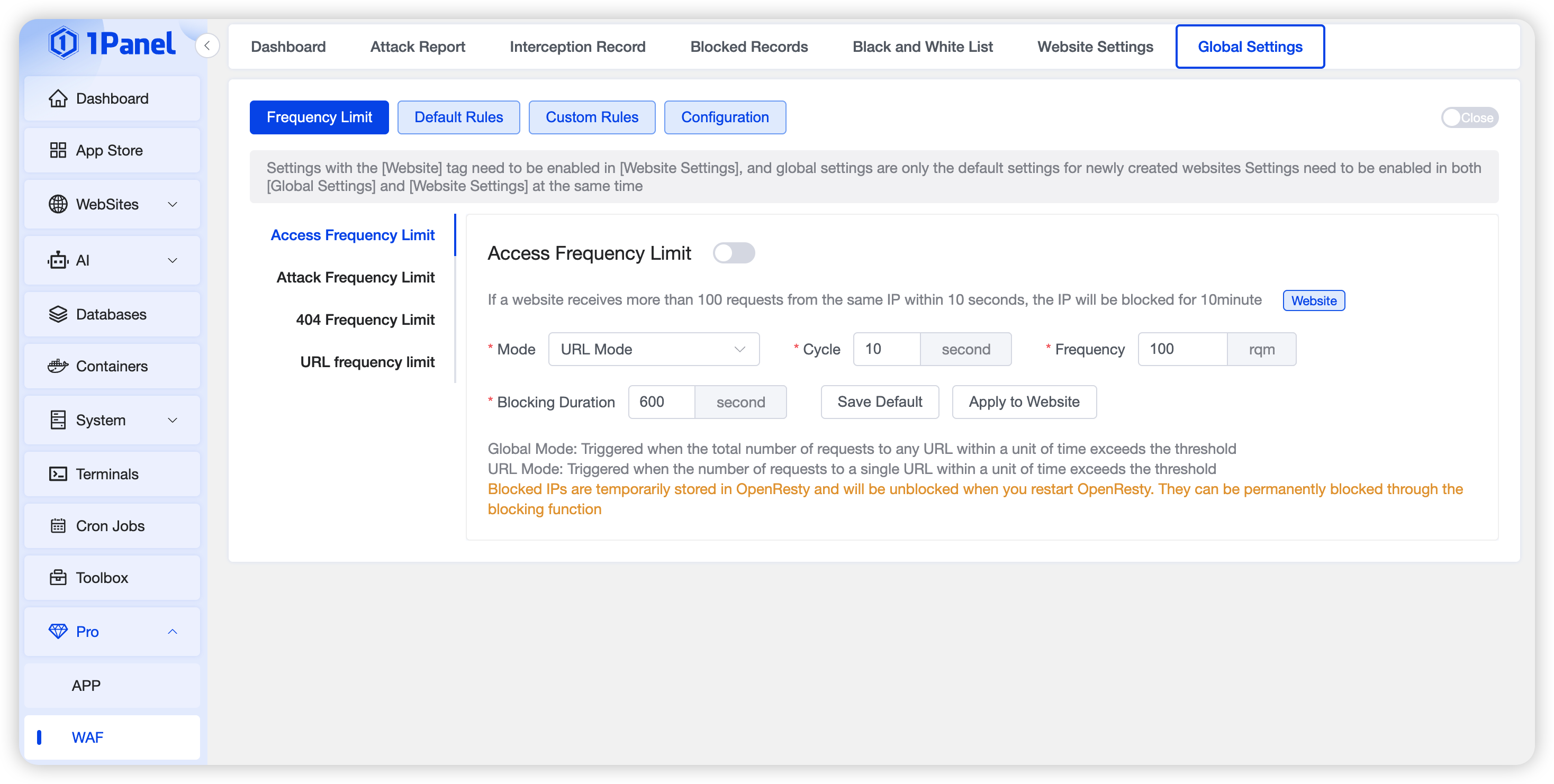 Notes: - The master switch in Global Settings controls rules for all websites. For example, disabling Access Rate Limit will disable it for every site. - Individual items in Global Settings (such as the first rule in Default Rules → Parameter Rules) only affect newly created websites after being disabled; existing websites are not affected.